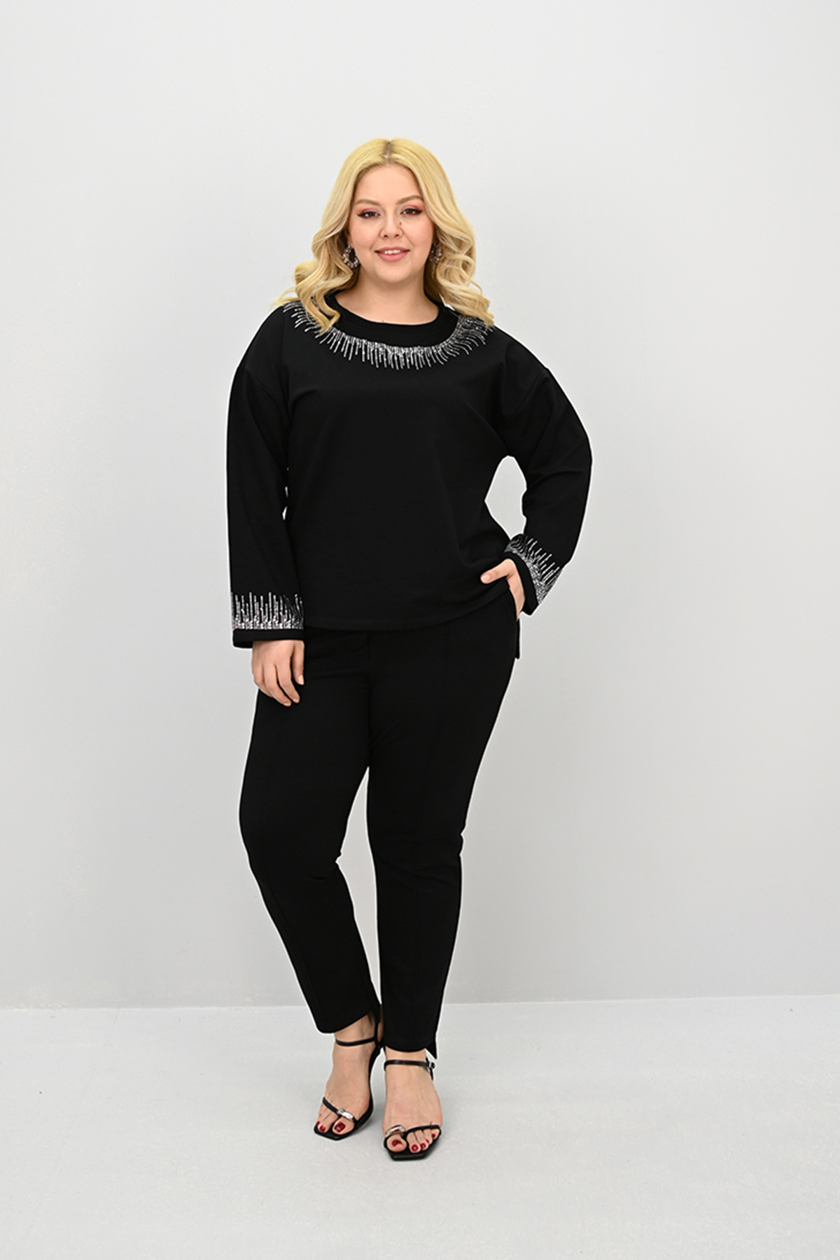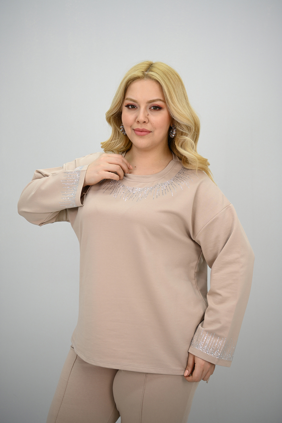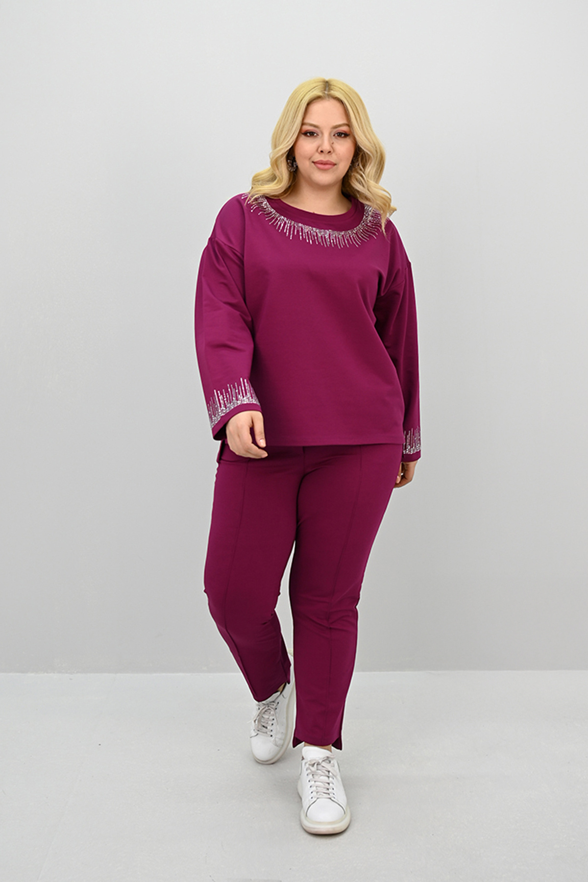 Şıklık ve konforu bir araya getiren büyük beden taş detaylı eşofman takımı, 42-50 bedene uyumludur.