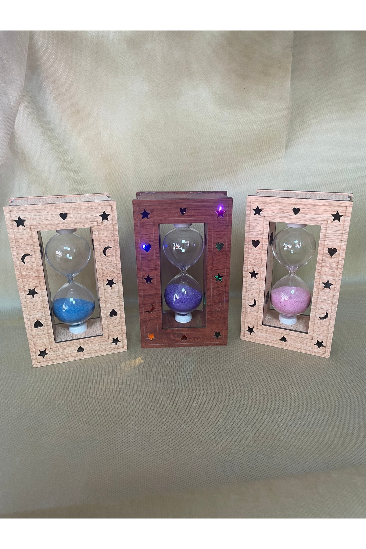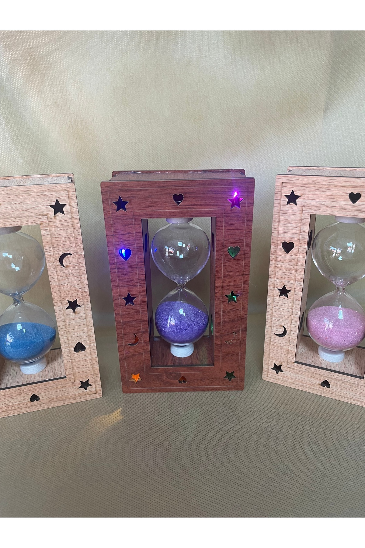 Dekoratif Ahşap Çerçeveli Kum Saati Malzeme: Ahşap gövde, cam kum saati Boyut: Yaklaşık 14 cm yükseklik Kum Süresi: Ortalama 3-5 dakika Dekorasyon: Masa üstü, kitaplık, ofis ve hediye amaçlı kullanıma uygun Detaylar: Yıldız, kalp, ay desenli lazer kesim çerçeve