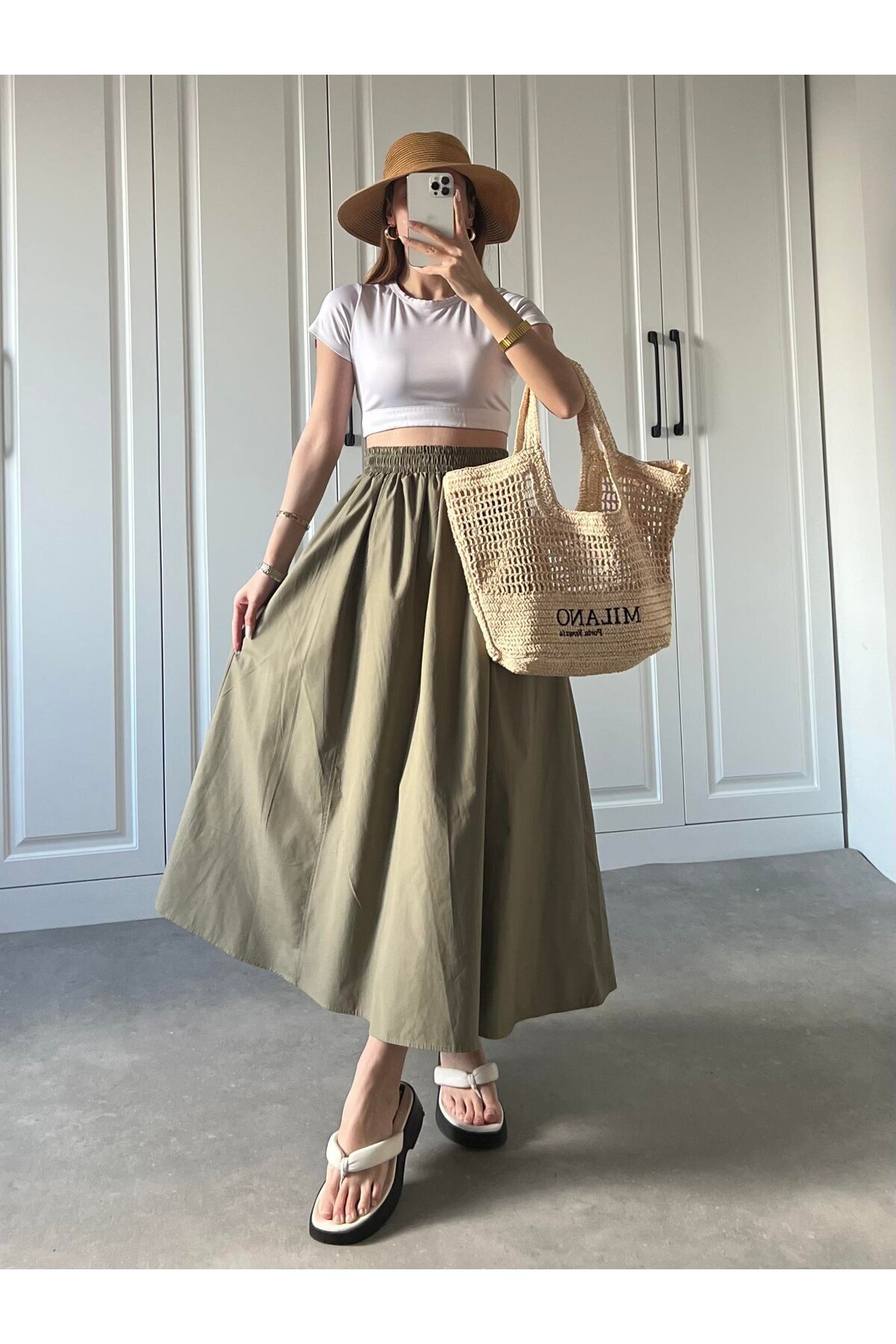 - Düz kesimiyle zamansız bir stil oluştururken, kloş silueti feminen bir hava katmaktadır.