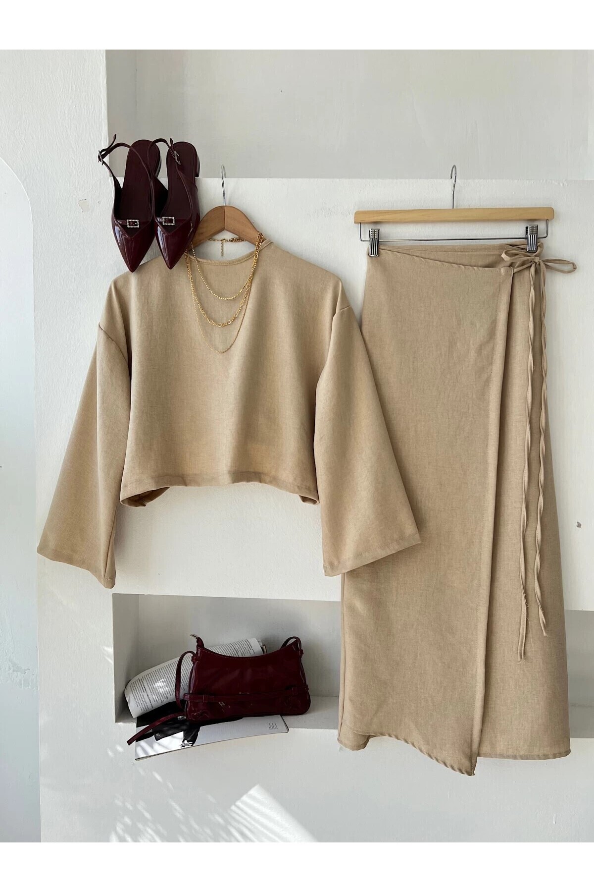 bluz ve etek olmak üzere şıklığı ve konforu bir arada sağlar.