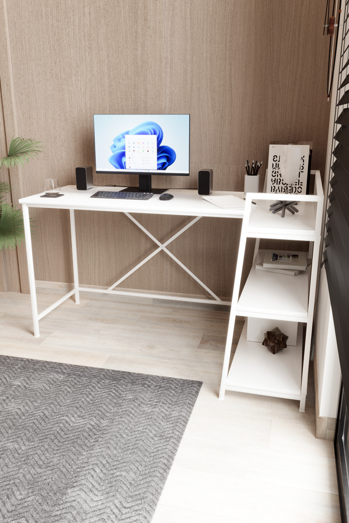 Beyaz Çift Yön Kullanıma Uygun, Raflı Çalışma Masası, Bilgisayar Masası, L Masa, Metal Ayaklı Flinder Kitaplıklı Çalışma Masası Bilgisayar Masası 1.Sınıf 18 mm suntalam malzemeden üretilmiştir.