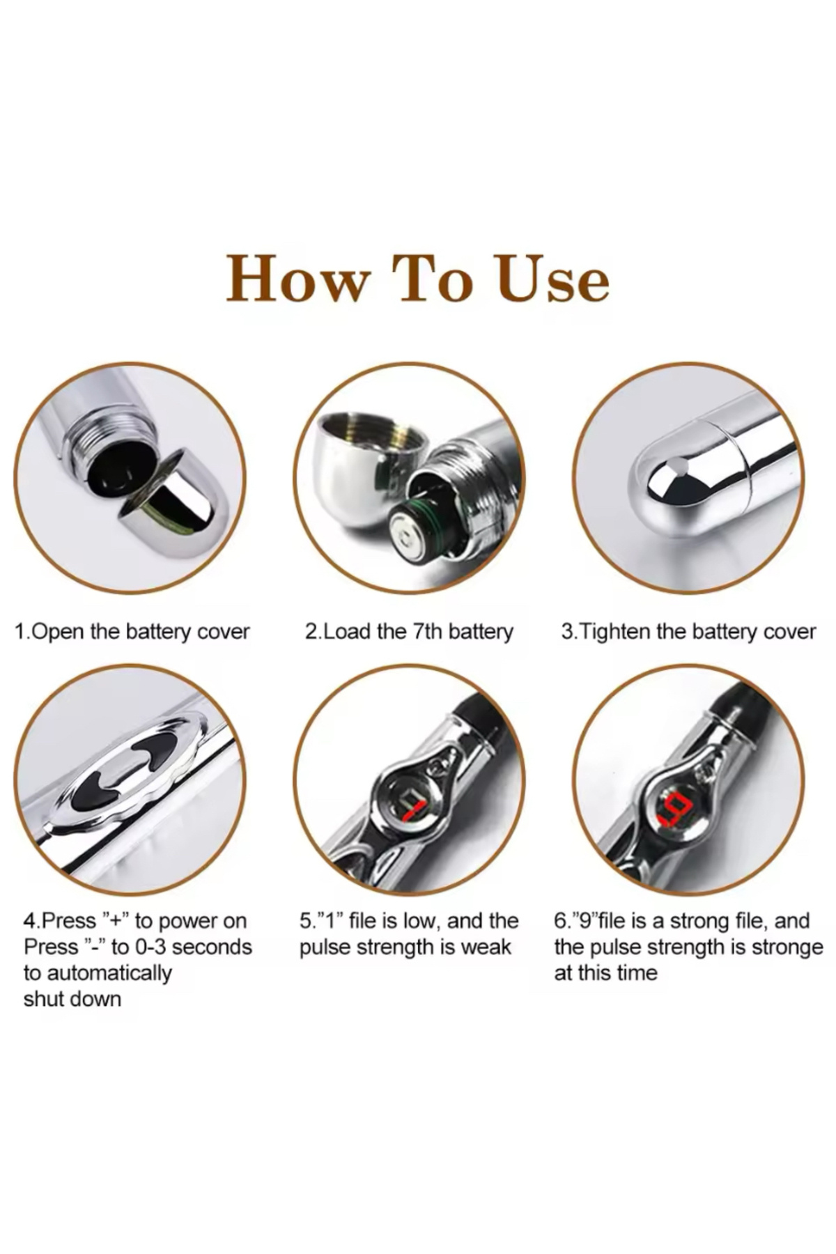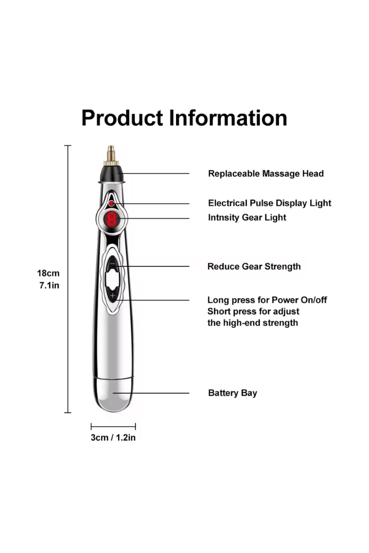 Ürün adı: akupunktur ve yakı Kalemi Ürün boyutu: 18*3*3cm Ürün ağırlığı: OPP torbalı 87g 3 kafalı pil modeli 116g, 3 kafalı şarj modeli 197g 5 kafalı pil modeli 157g, 5 kafalı şarj modeli 203g Renk kutusu boyutu: Pil versiyonu 8,5 * 3 * 20,2 cm Şarj versiyonu: 22,8 * 10,3 * 4 cm Kullanım kılavuzu: Çince ve İngilizce kullanım kılavuzları (varsayılan İngilizce kullanım kılavuzu).