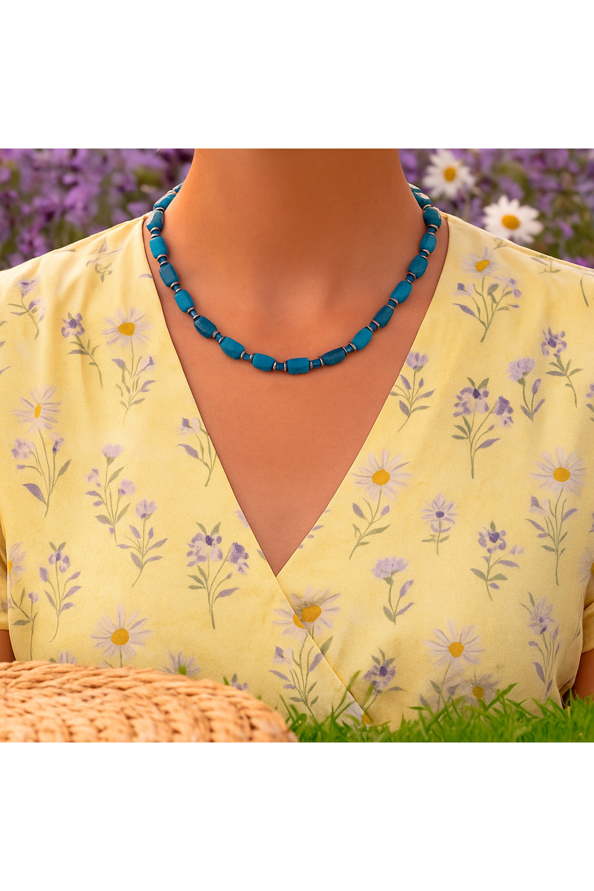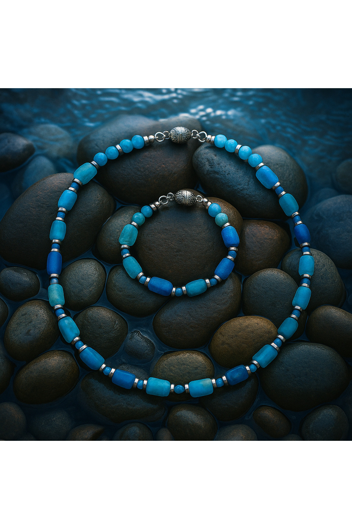 Doğal mavi akik taşıyla el yapımı bu set, dingin enerjisi ve şık görünümüyle size eşlik eder.