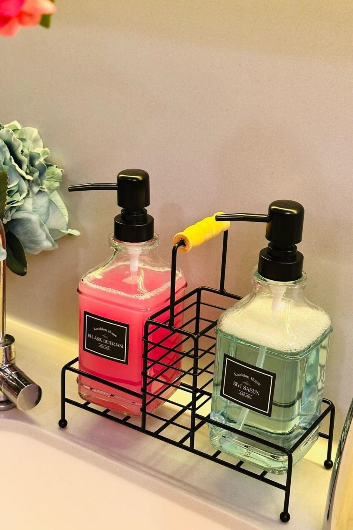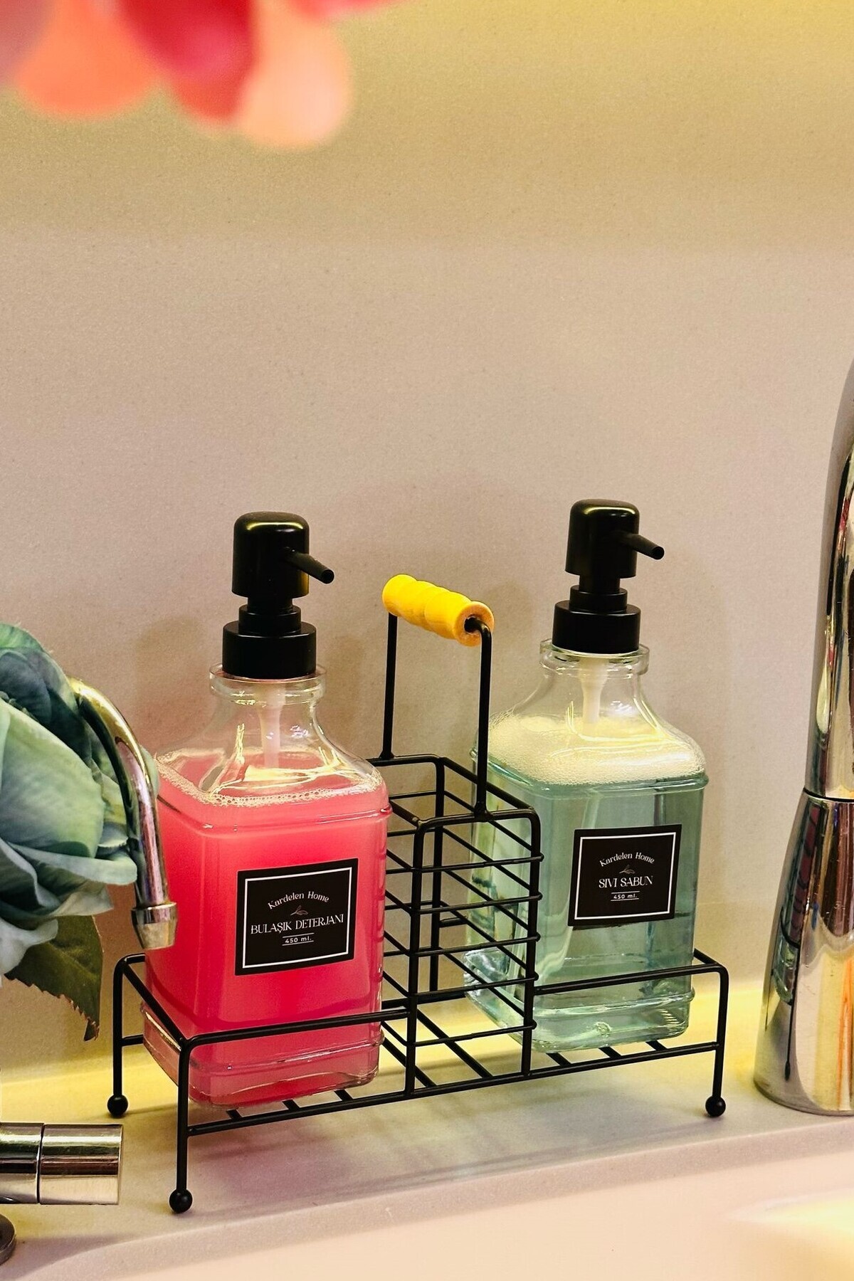 Ürün Özellikleri: Cam Şişe:450 ml hacmindedir, dayanıklı ve şık görünümlü Çok Amaçlı Kullanım:Sıvı sabun, bulaşık deterjanı, şampuan veya dezenfektan için uygundur Metal Stand:Kaymaz, sağlam ve paslanmaz tel yapı sayesinde uzun ömürlü kullanım Dekoratif ve Minimal:Tezg h üstü düzen sağlar, mutfağa ve banyoya zarif uyum Kullanım Alanları: Mutfakta bulaşık deterjanı veya sabun için, banyoda şampuan veya el sabunu için Hem işlevsel hem de dekoratif!