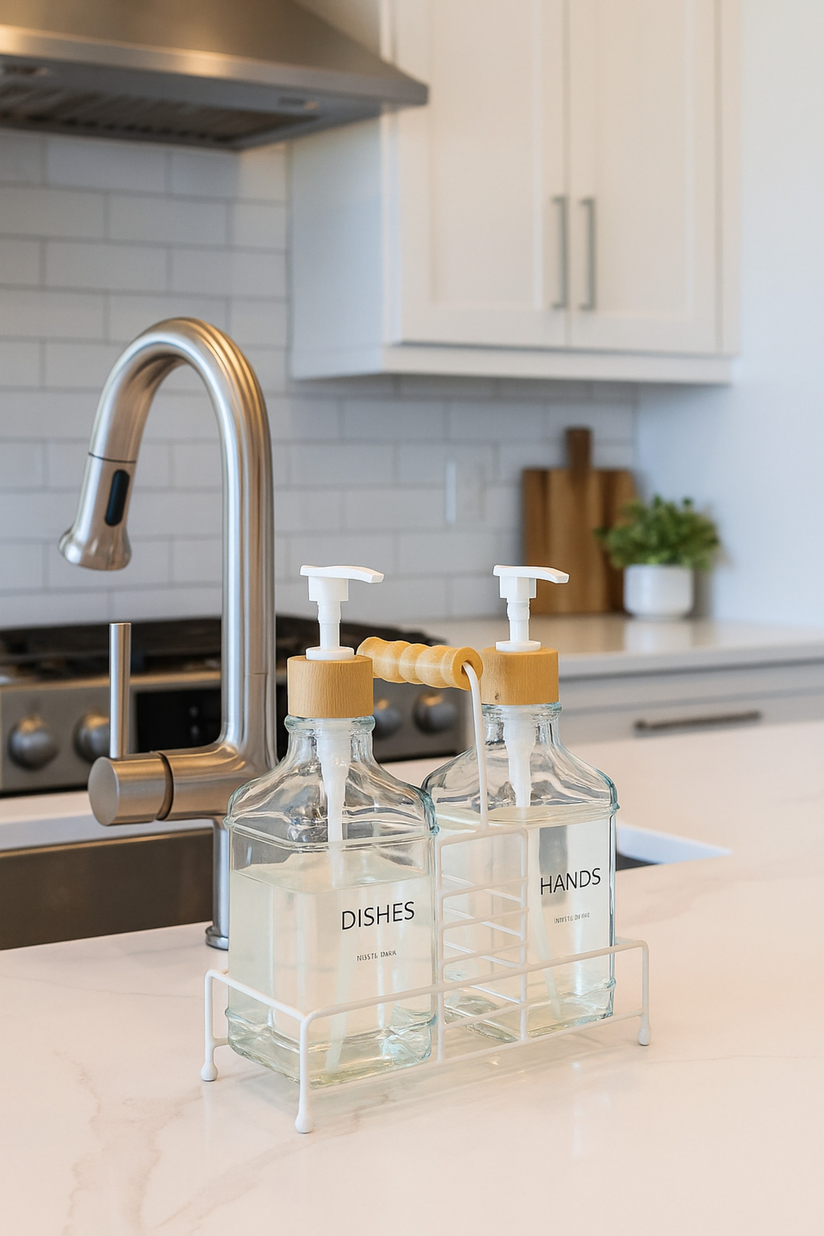 Makri Home Cam Sıvı Sabunluk & Deterjanlık Seti 450 ml, Metal Standlı Zarafet ve pratiklik bir arada! Makri Home un estetik tasarımlı cam sabunluk ve deterjanlık seti, mutfağınıza hem şıklık hem düzen katıyor.