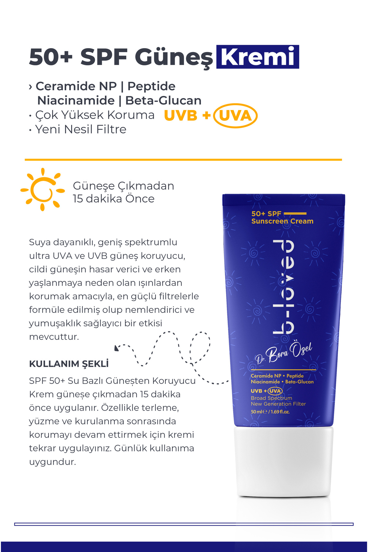 - SPF 50+ Geniş Spektrumlu Güneş Kremi, cildinizi UVA ve UVB ışınlarına karşı koruyarak yaşlanma etkilerini önler.