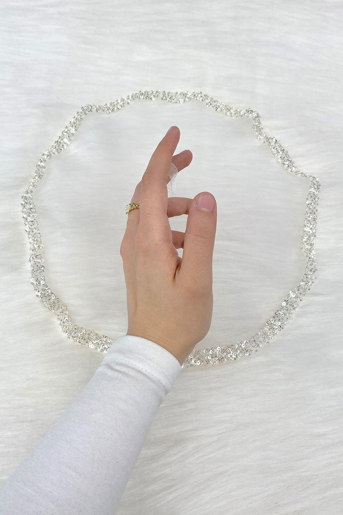 Duvak, Kuşak, 2 Adet Eldiven(Trend Model Ucu Açık Bilekten Lastikli) ve 2 Adet El Gülü Olmak Üzere Toplam 6 Parça Set.