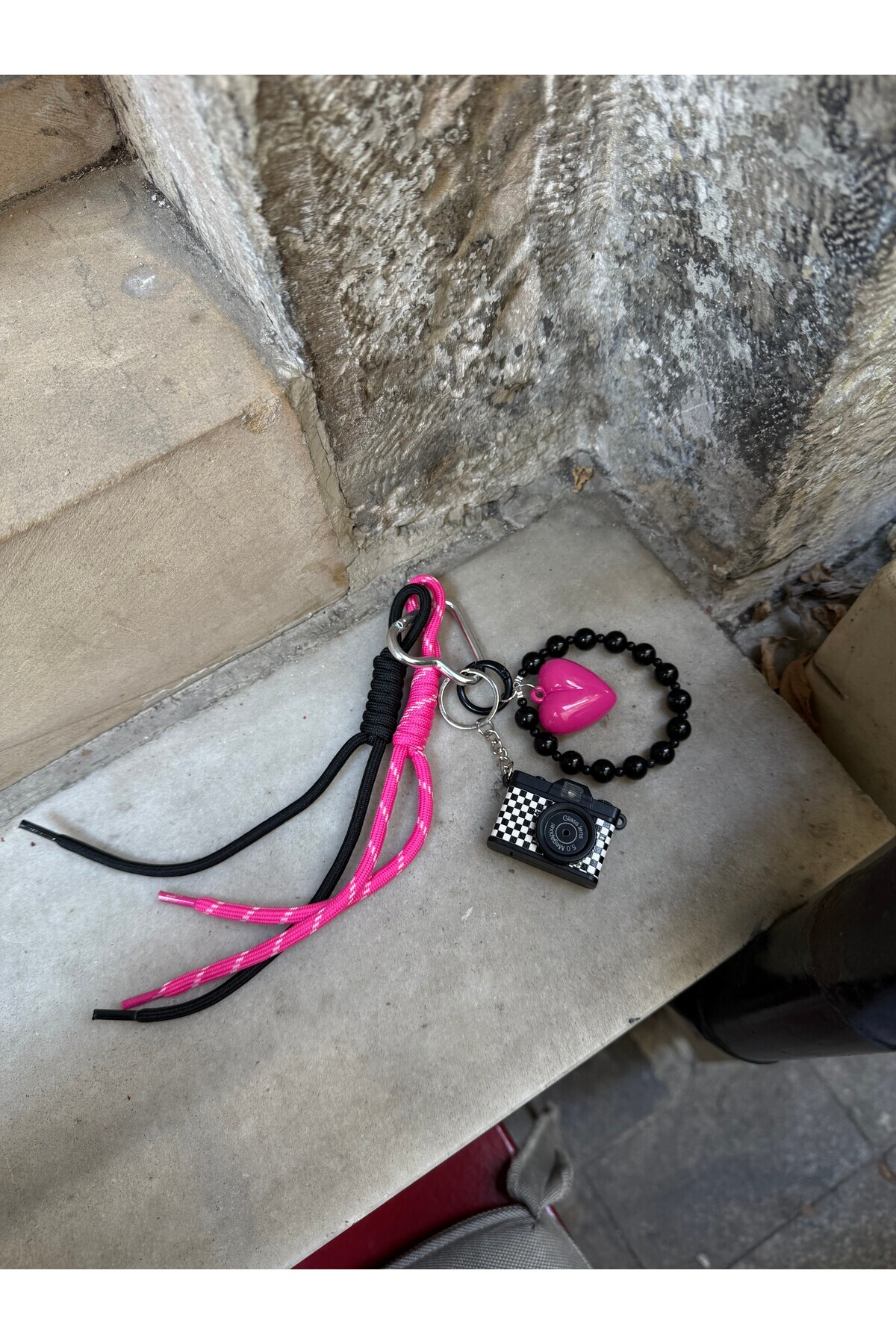 Karabina Detaylı Flaş Işıklı ve Sesli Fotoğraf Makinesi Kalp İp Sarkıtlı Çanta Charm Anahtarlık