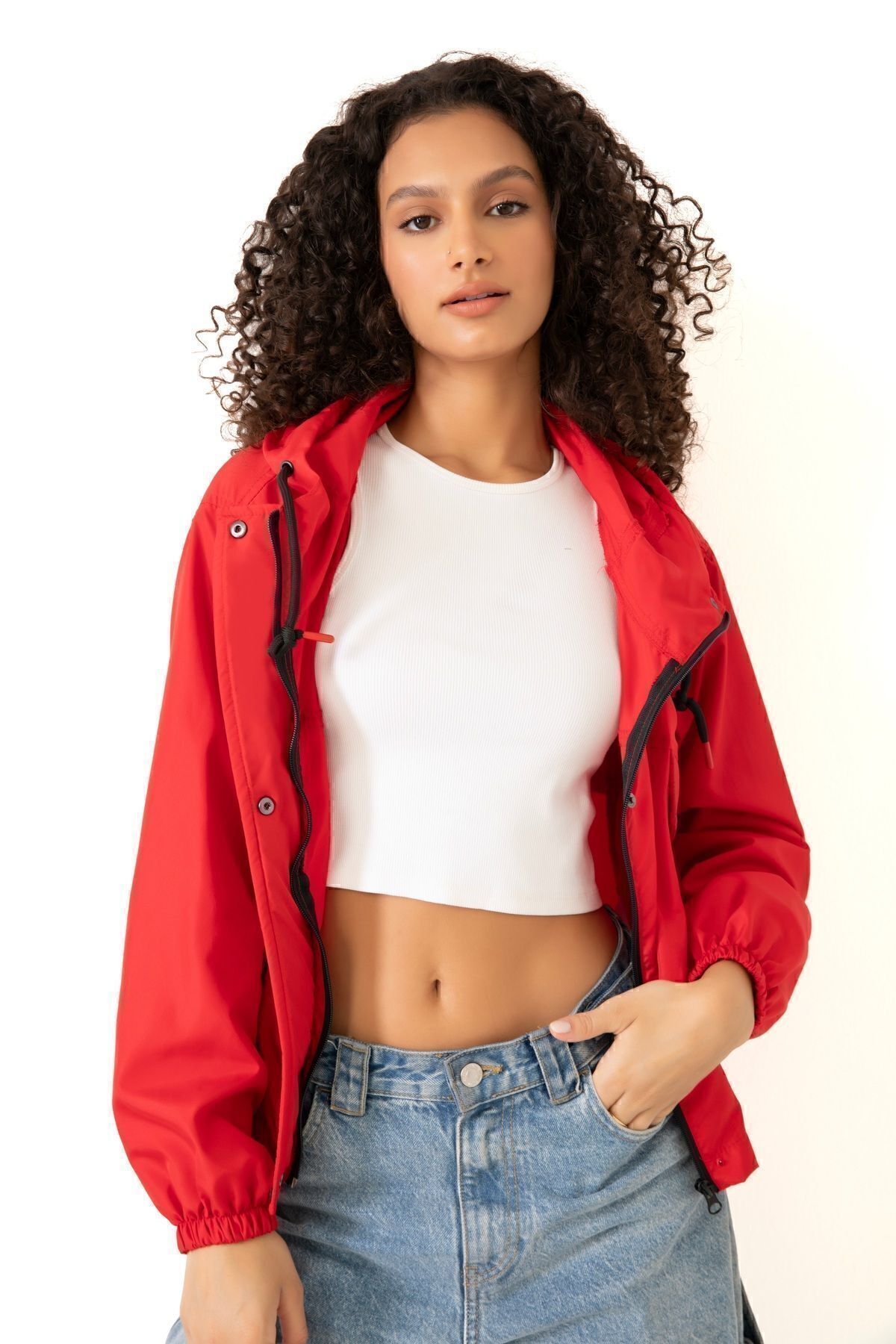Spor Kadın Kırmızı Su Geçirmez ve Rüzgara Dayanıklı Kapüşonlu Çıt Çıtlı Mevsimlik Yağmurluk