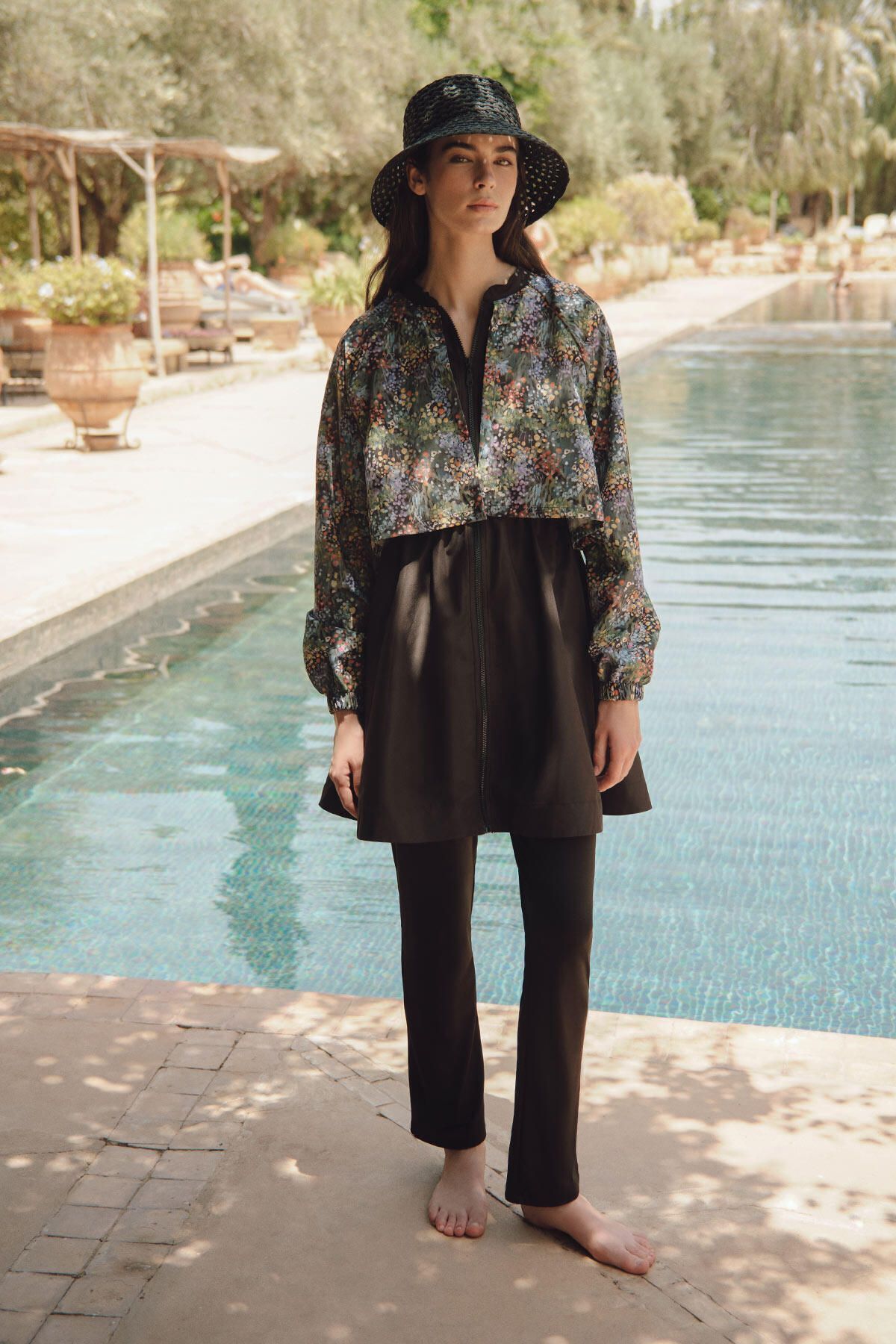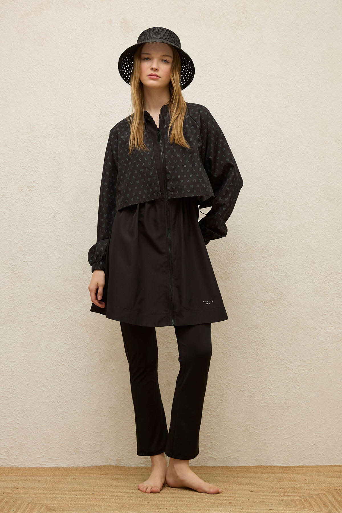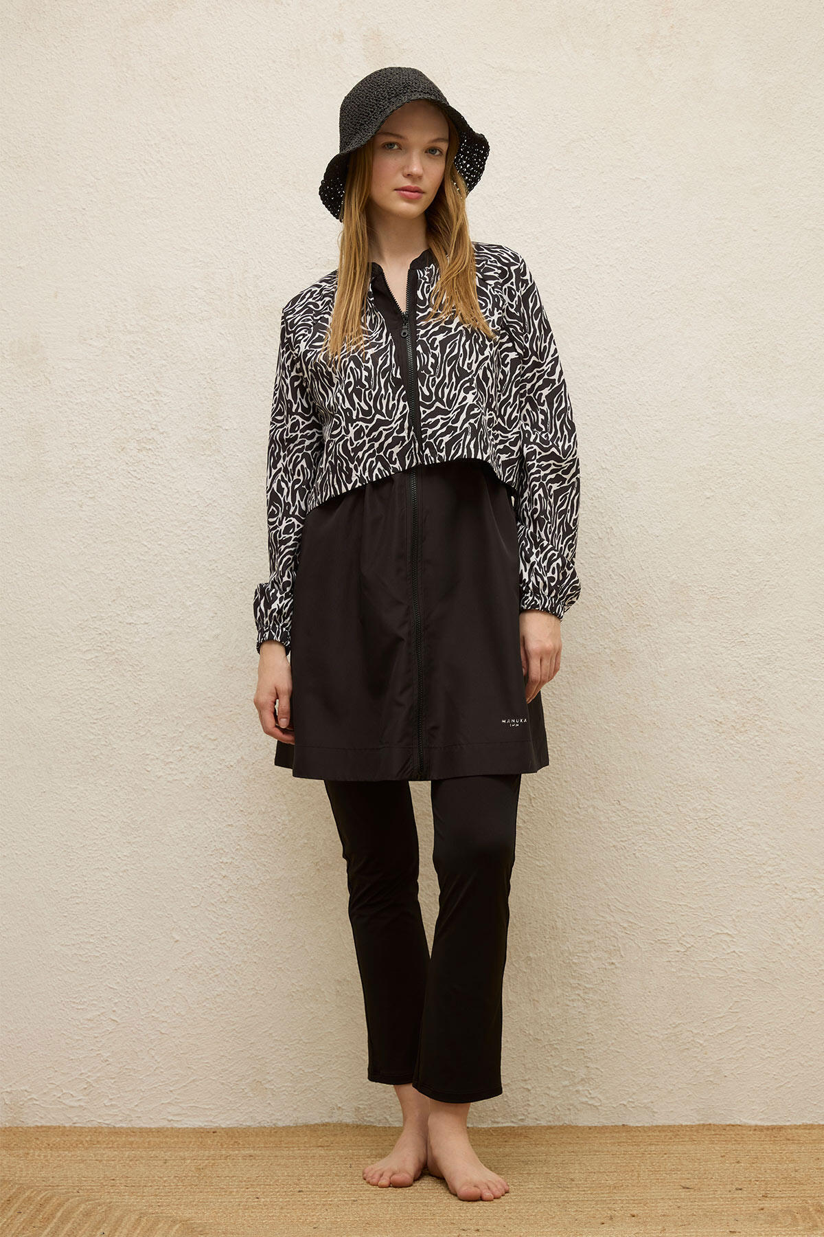 Yüksek yaka, fermuar kapamalı, üst beden baskılı, kol ucu lastikli, bedeni hızlı kuruma özellikli dokuma kumaşından, beli lastikli ve stoperli.