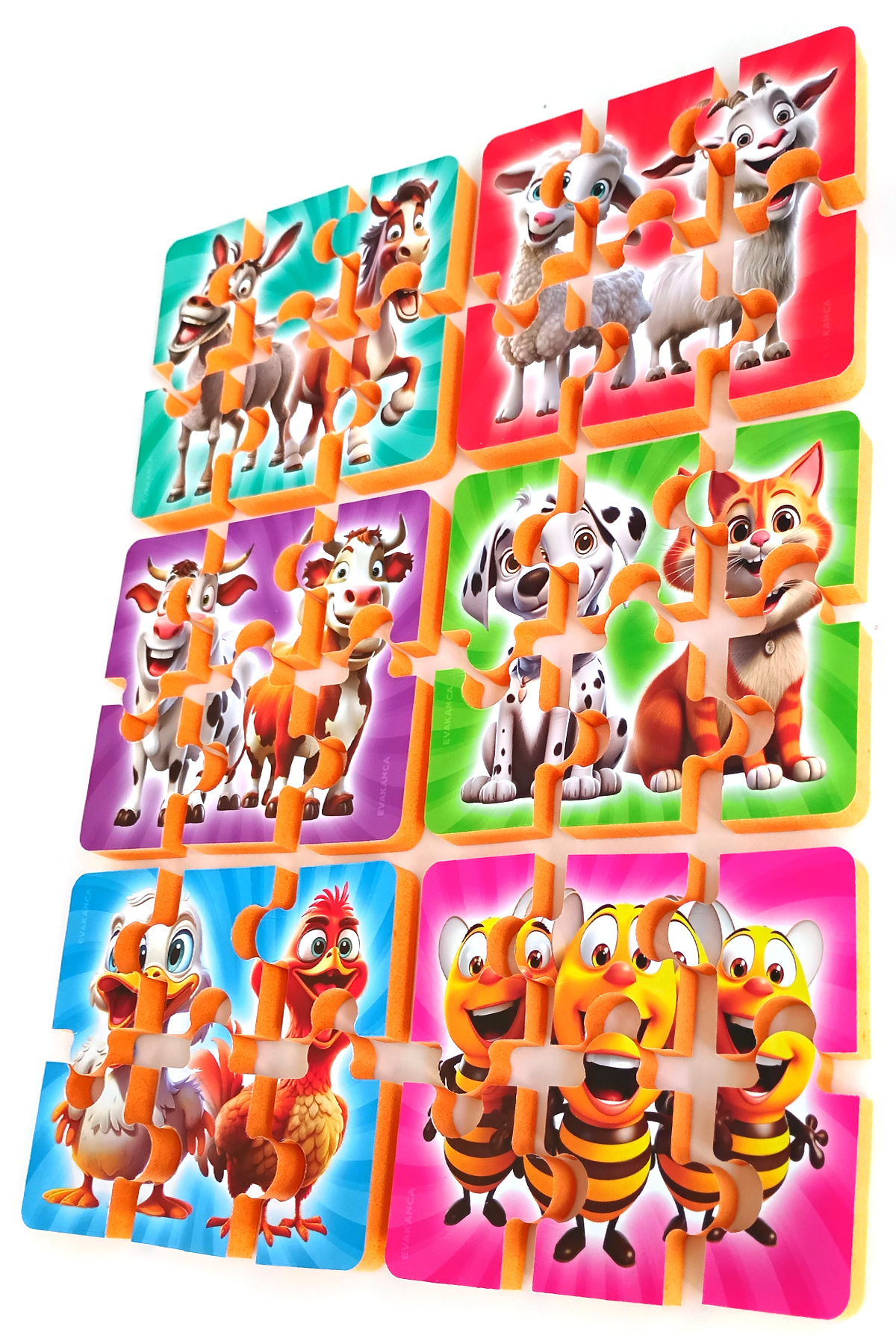 6 Parçalı 6ş'ar Adet Çiftlik Hayvanları, Yaban Hayvanları ve Taşıtlar Olmak üzere 18 tane yapboz içermektedir.