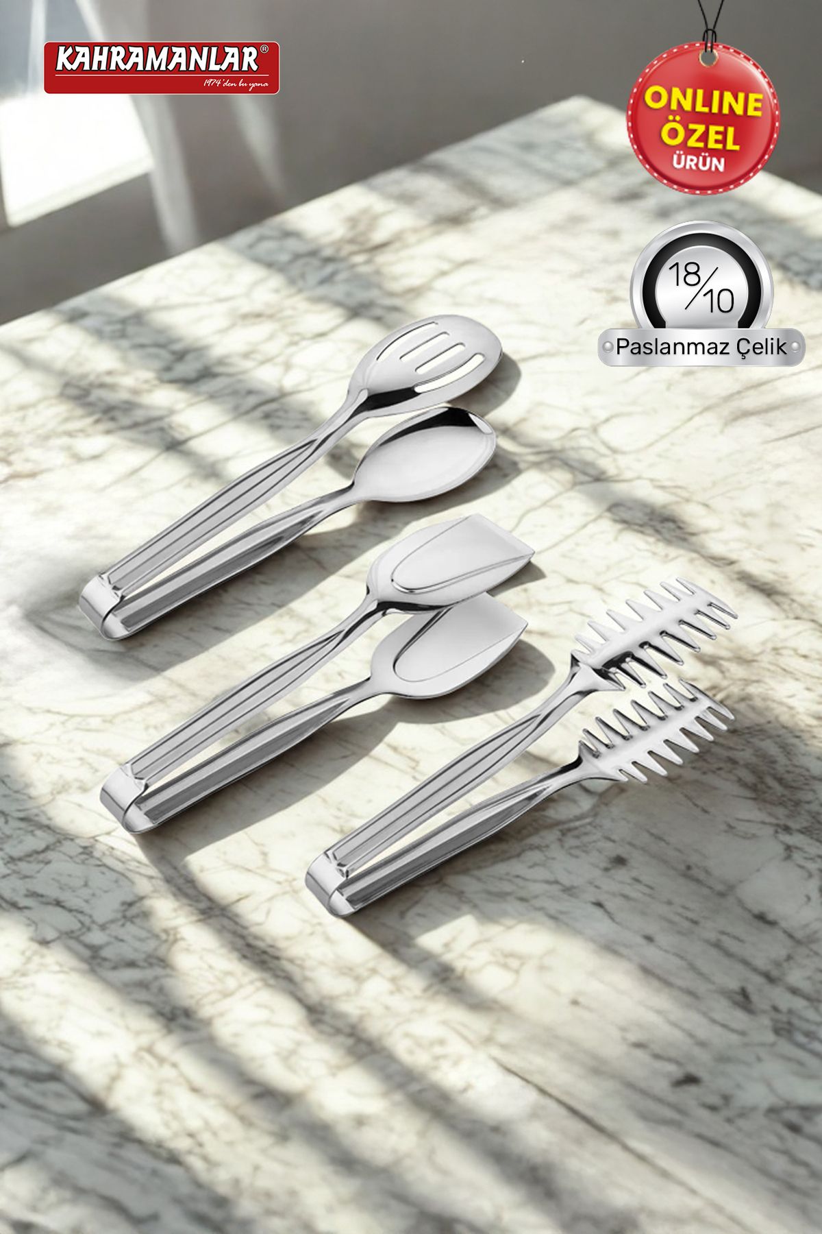 Demre 3'lü Platin Çelik Izgara Salata Krep Maşa Seti