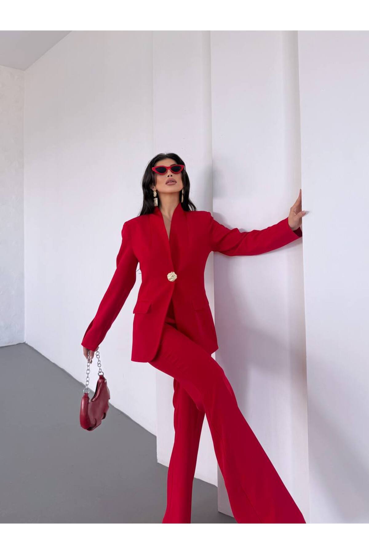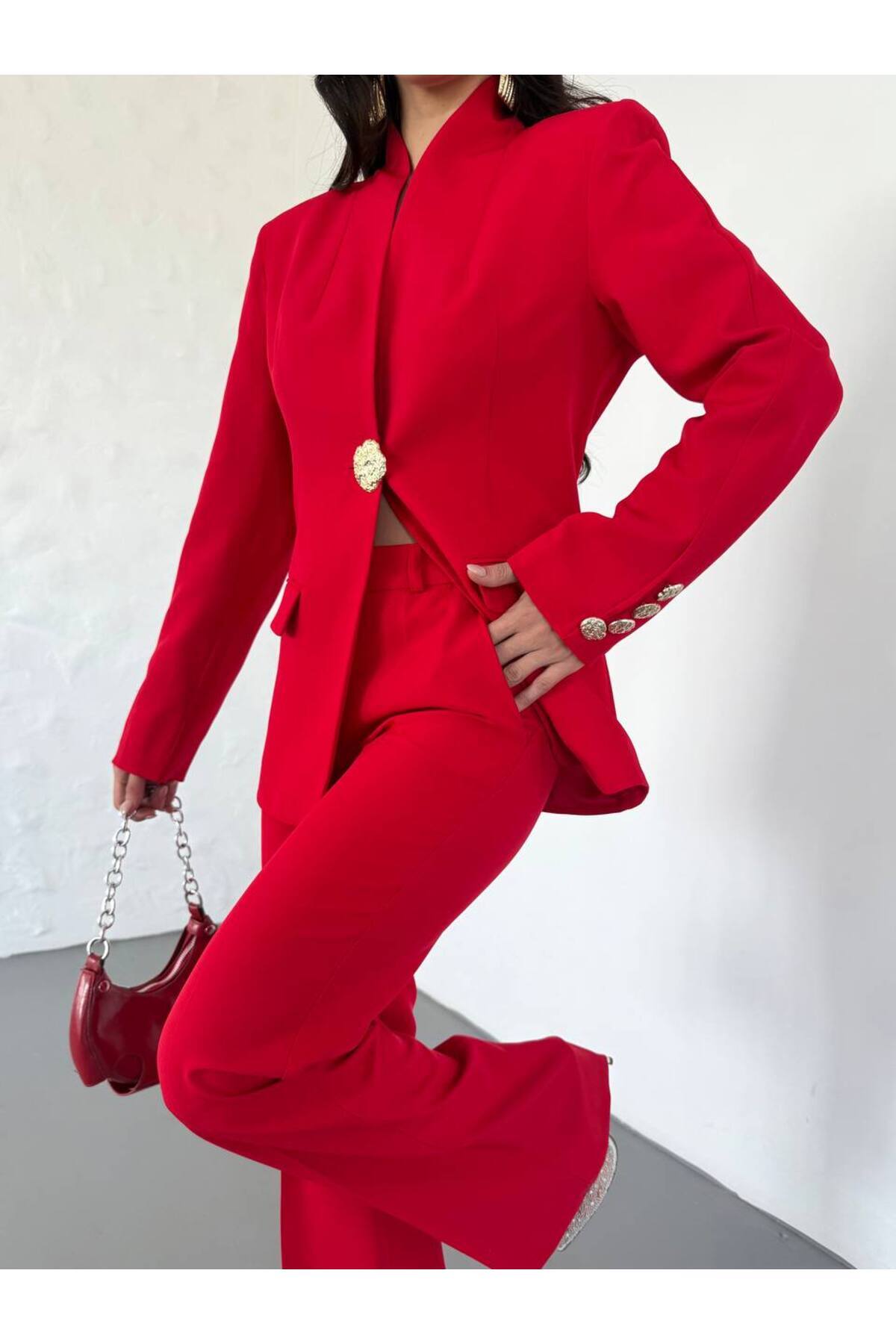Kadın Gold Kurabiye Düğmeli Blazer Ceket Palazzo Pantolon Takım Elbise