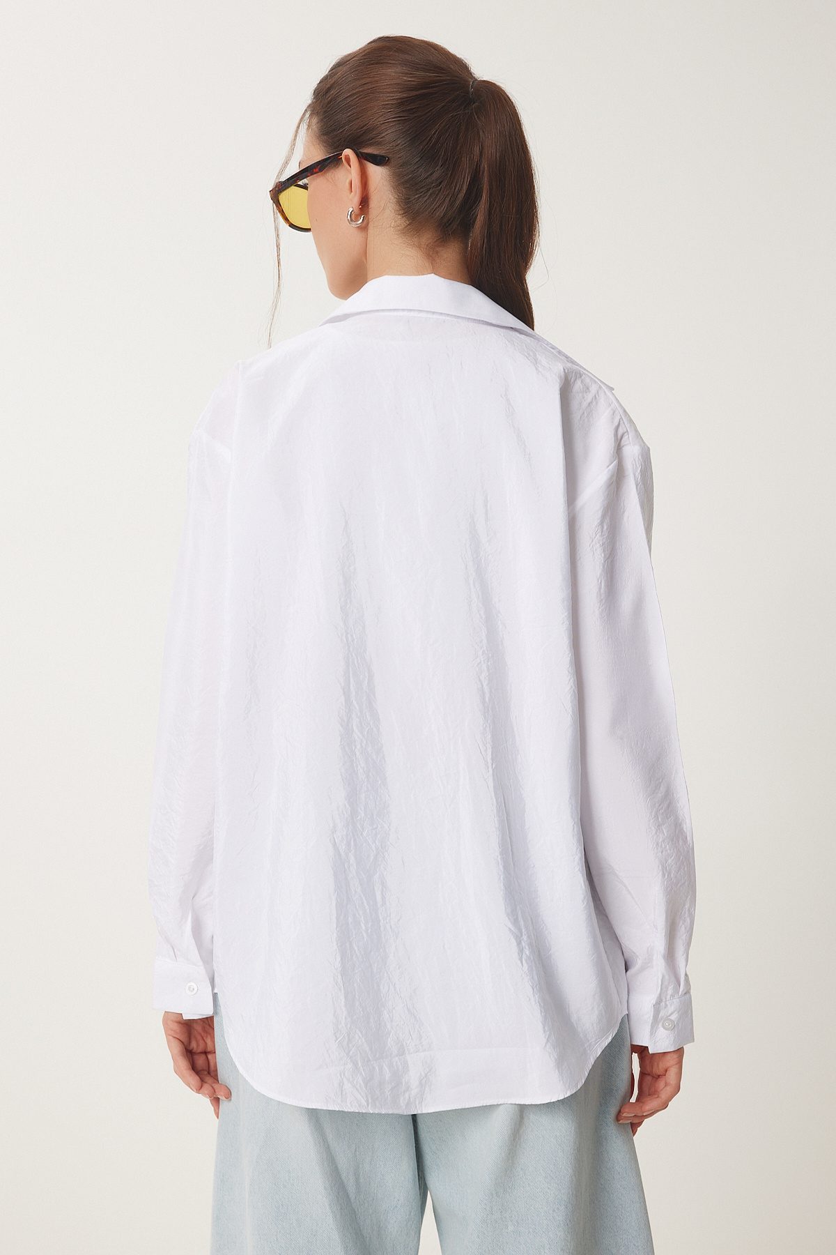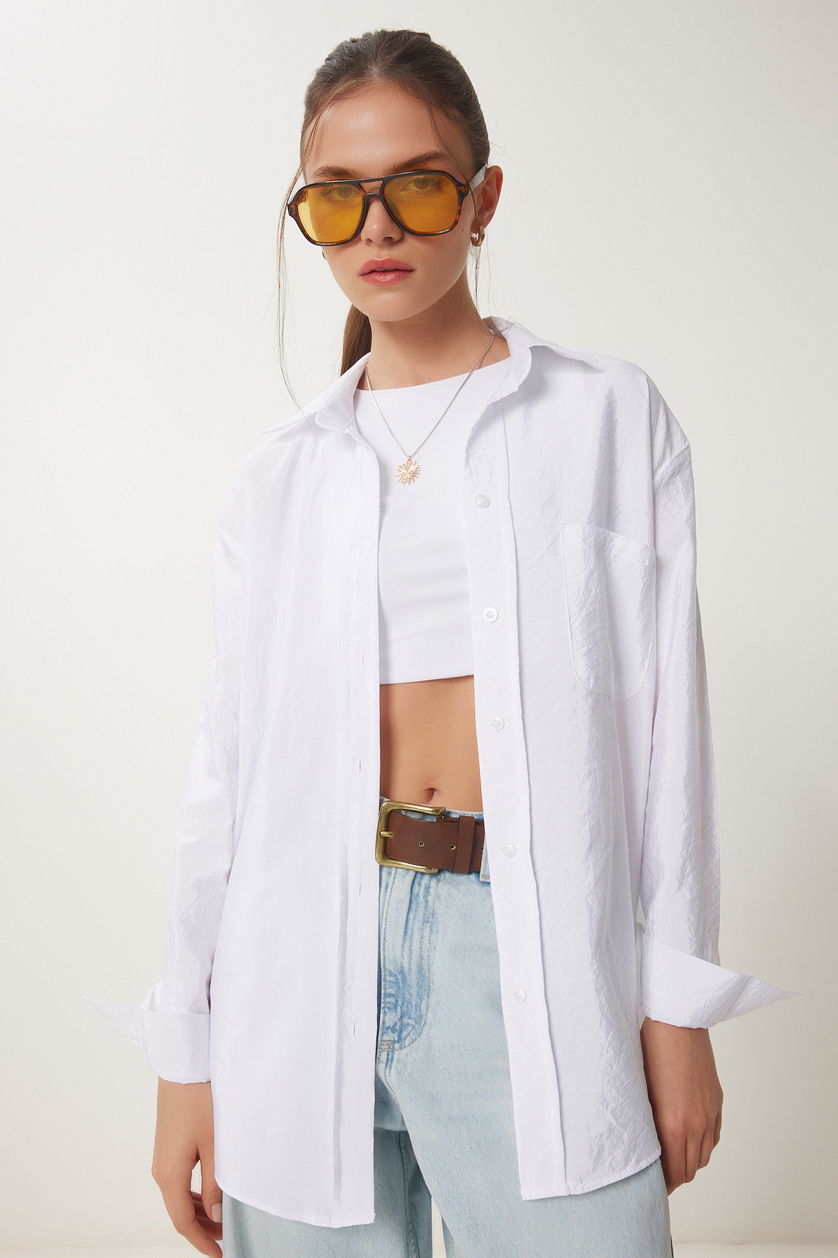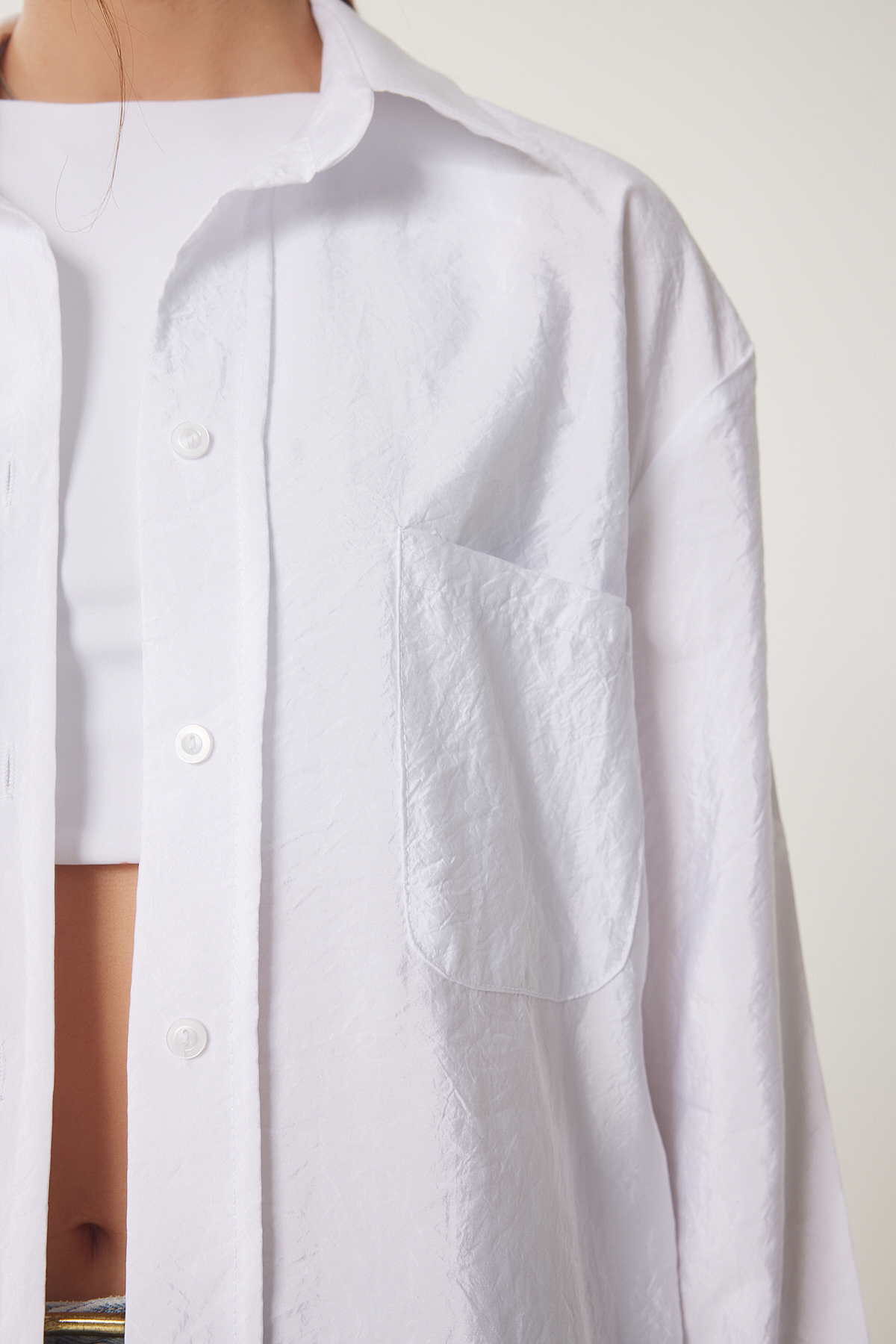 Düğme kapamalı, düşük omuzlu, oval kesim, ön cepli ayrobin gömlek