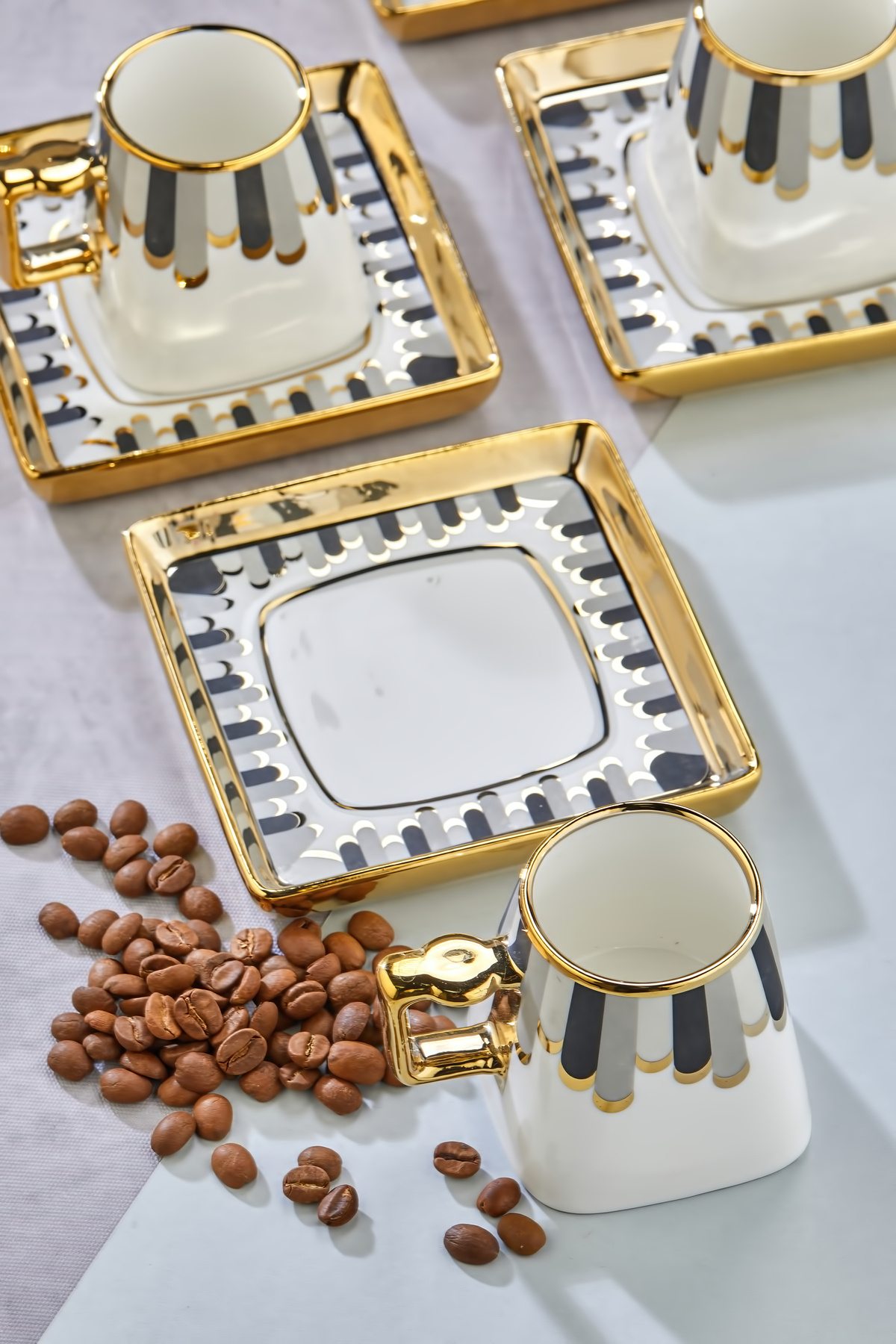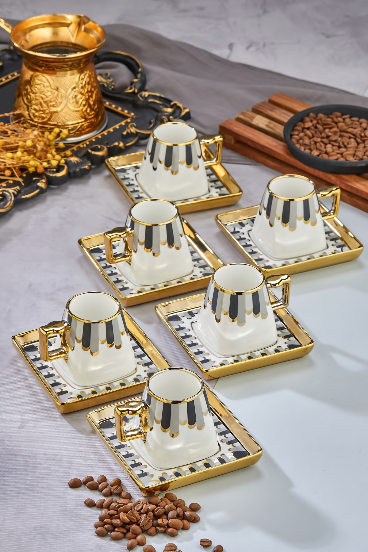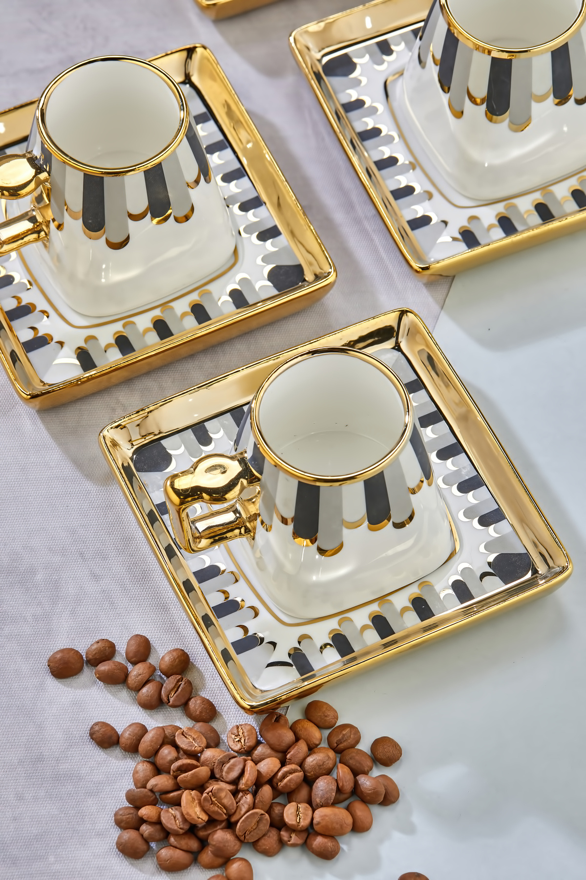 90 ml Porselen 6'lı Kahve Fincanı Seti - Şık Tasarım Altın Yaldızlı Modern Fincan Takımı