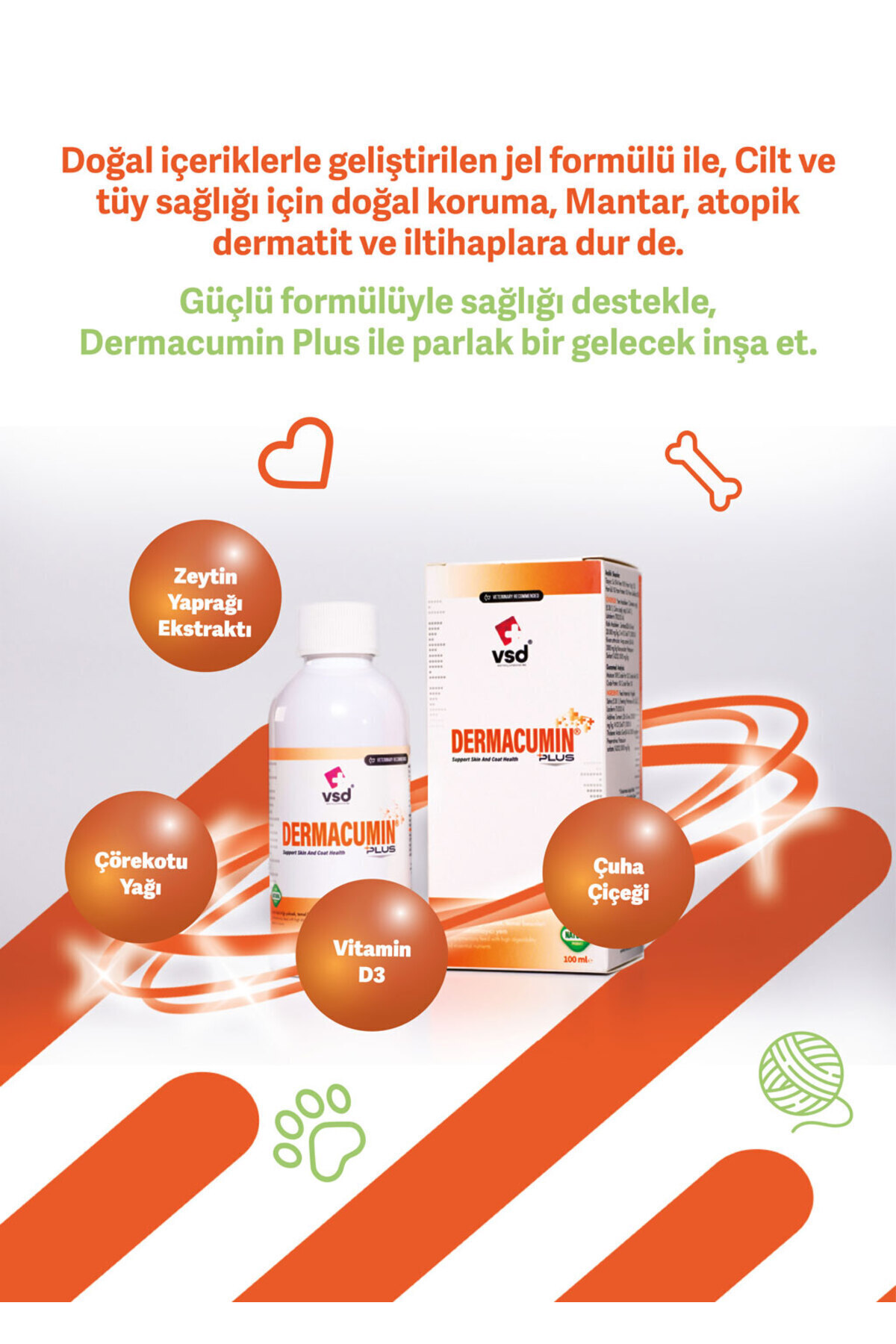 İçerik Bilgisi: Zerdeçal (Curcuma Longa), Çörekotu Yağı (Nigella Sativa), Çuha Çiçeği (Qenothera Biennis), DVIT3 Dermacumin Plus, kedi ve köpeklerde görülen Allopesi, Atopy, Atopik Dermatit, Mantar enfeksiyonları ve Otoimmun dermatitlerde (Petimmun ile birlikte), Kronik dermatitlerde ise (Retino A ile birlikte) kullanılabilen bir tamamlayıcı yemdir.