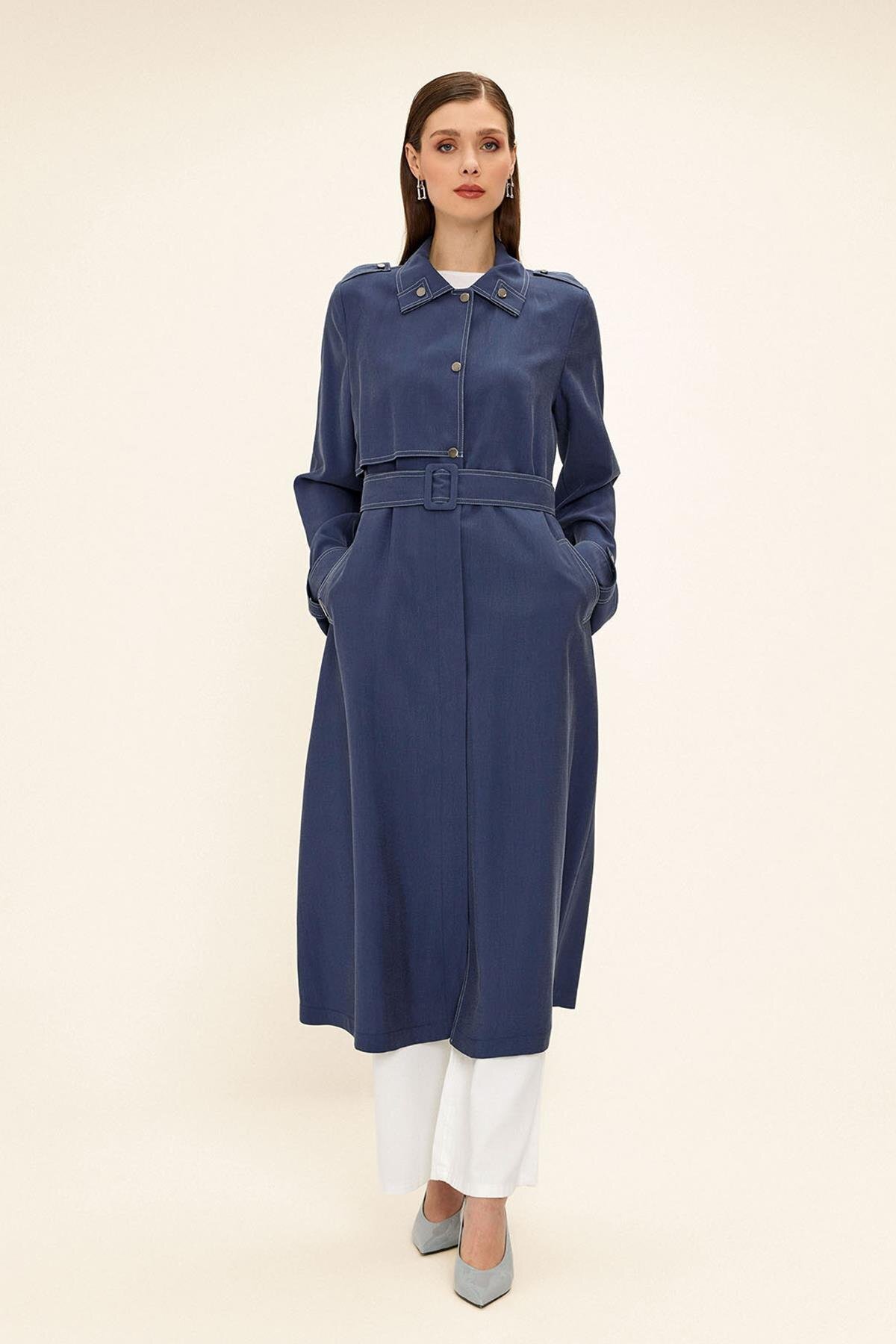 Kontrast Dikiş Detaylı Astarsız Modal Trençkot İNDİGO 6717