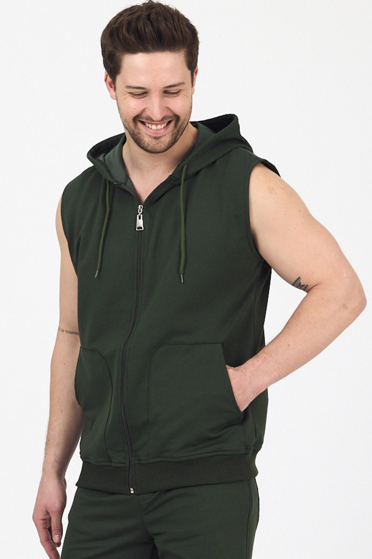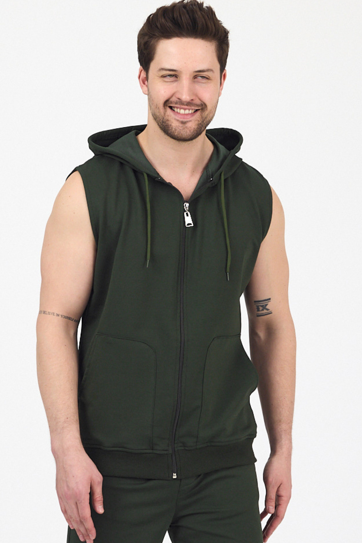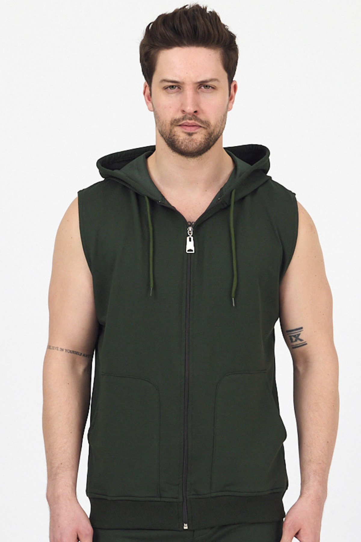 Erkeklerin sportif ve rahat tarzını yansıtan, popüler olan kapüşonlu, kolsuz ve fermuarlı sweatshirt yelek.
