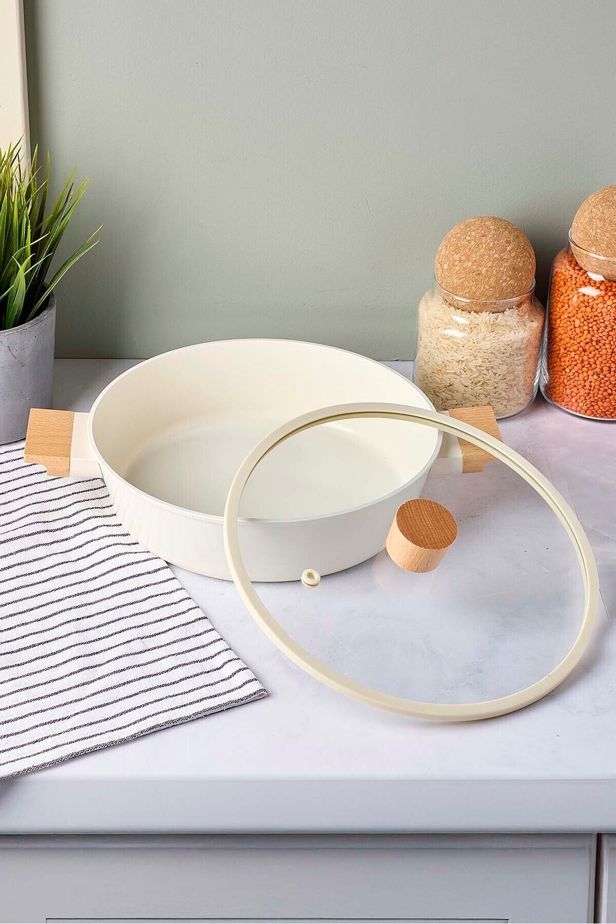 -Doğal ahşap detayları ve sade rengiyle dikkat çeken CookWood Beige 24 cm Derin Tencere, hem görsel uyum hem de pratik kullanım arayanlar için özenle tasarlandı.