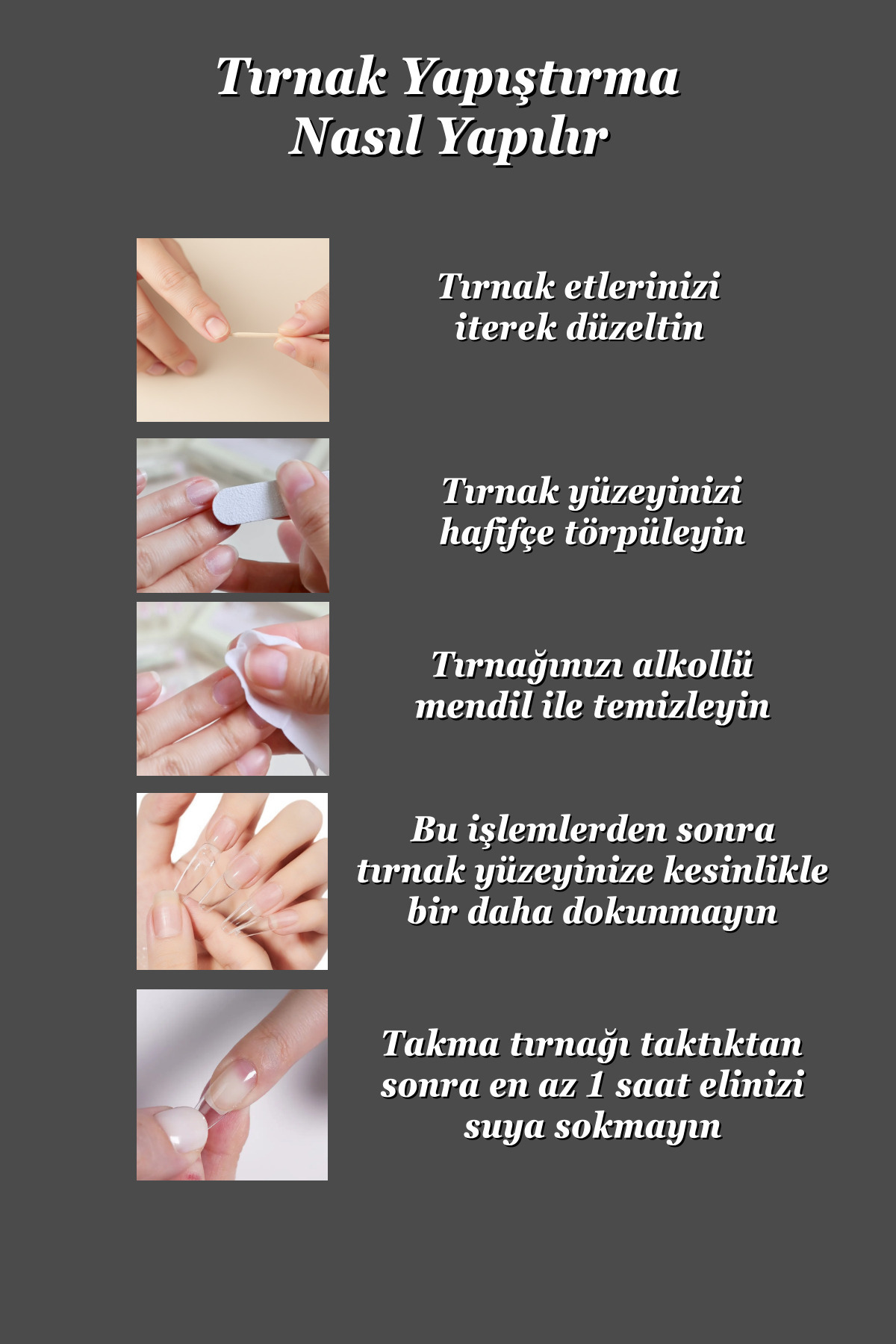 Son olarak takma tırnağı yapıştırdıktan sonra 1-2 saat ellerinizi suyla temas ettirmemeniz gerekiyor ki yapıştırıcı tam olarak yapışsın.