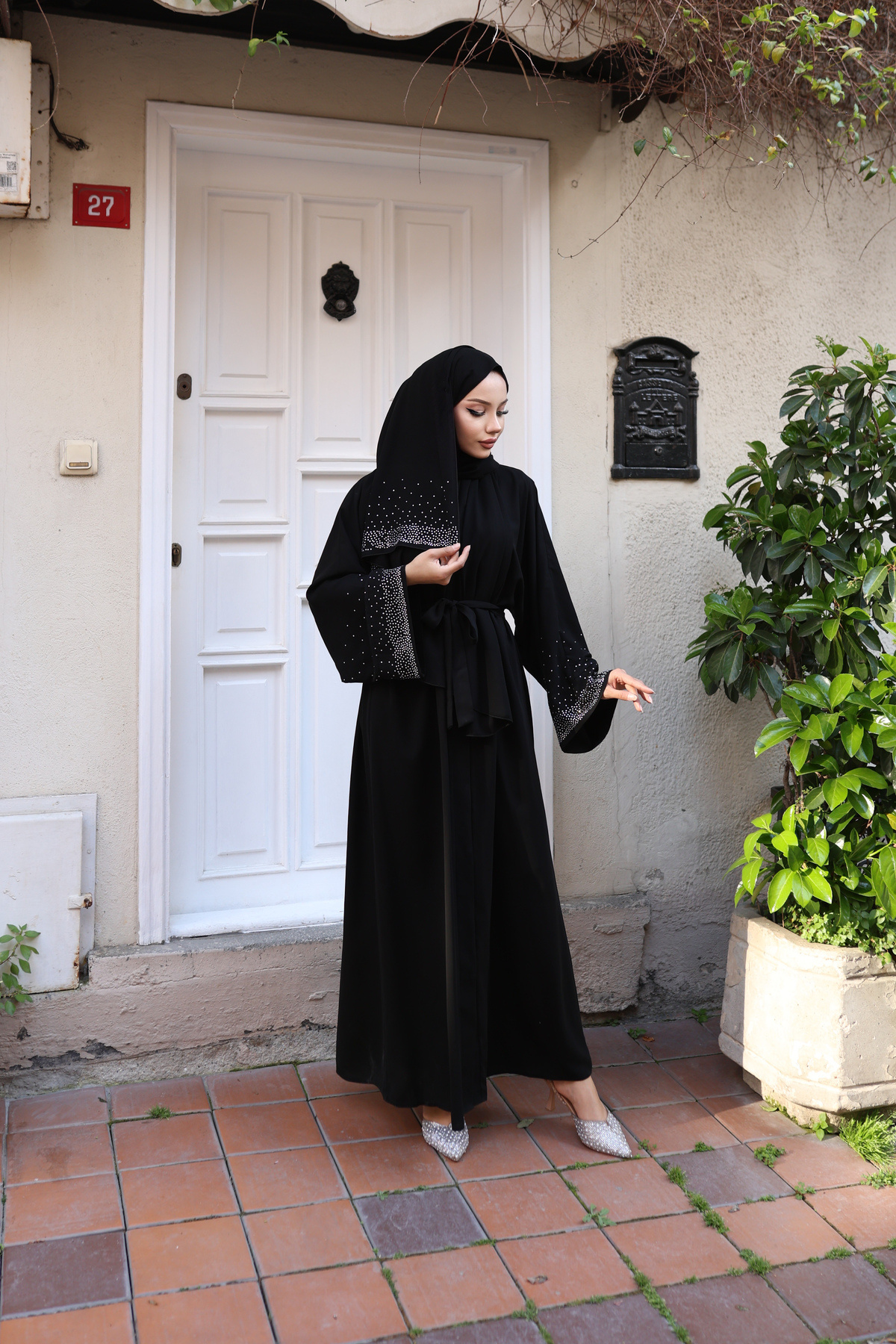 Zarif tasarımıyla dikkat çeken Kristal Taşlı Taşlı Abaya şıklığınızı tamamlar.