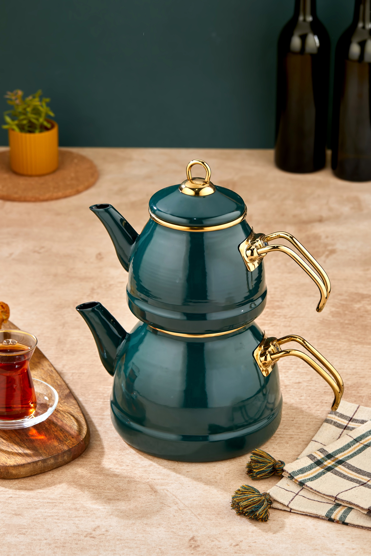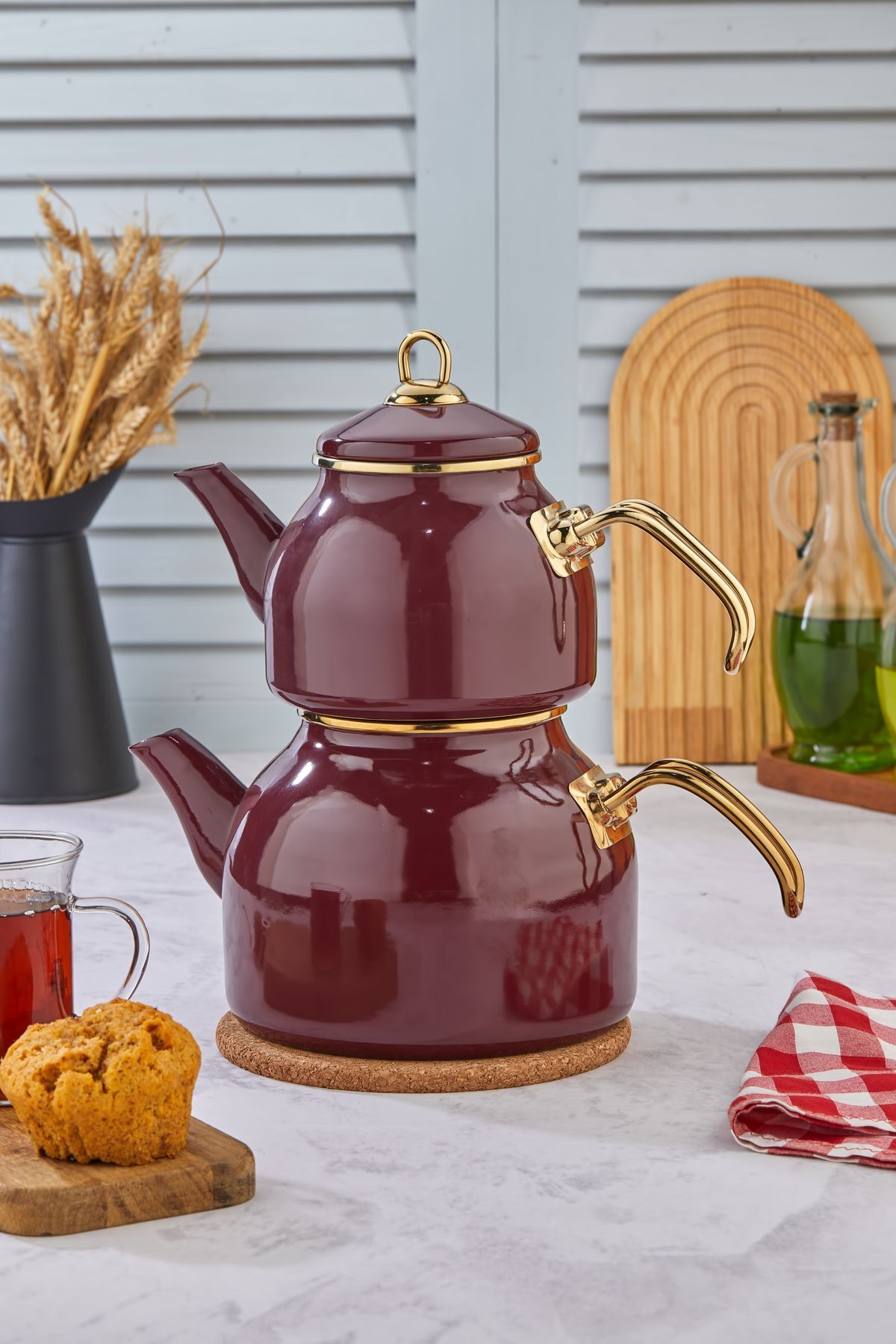 Emayye Özel Tasarım Yapışmaz Yüzey Demlik Seti Emaye Çaydanlık
