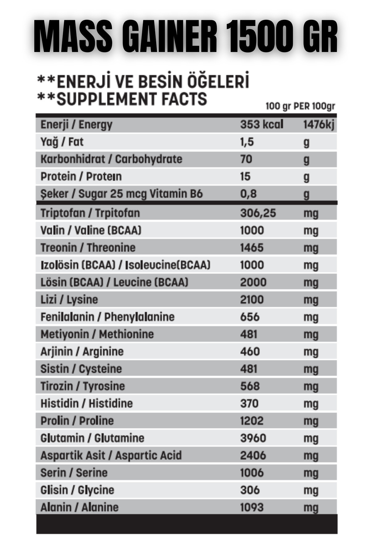 Mass Gainer 1500 gr Çikolata Aromalı – Yüksek Karbonhidrat & Protein – Bcaa Ve B6 Vitaminli