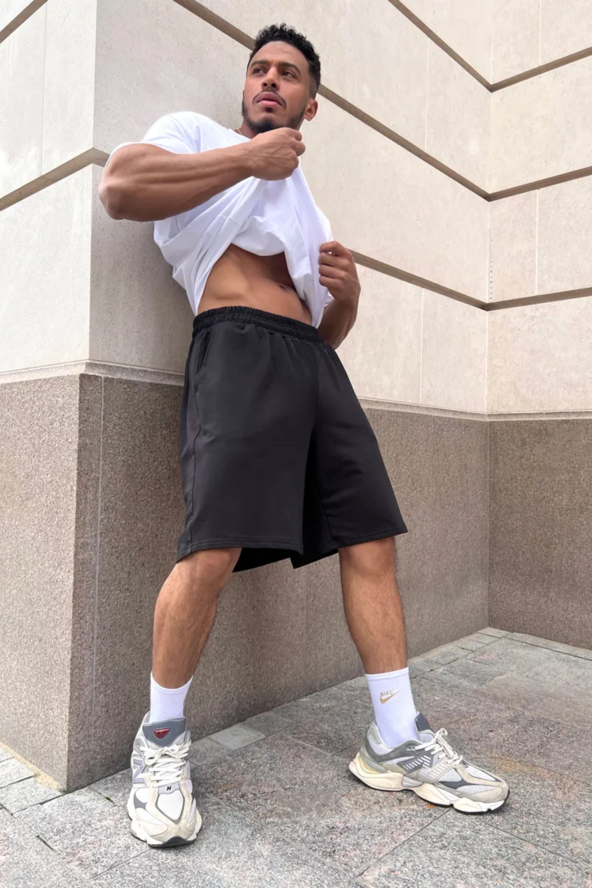 - Rahat kesimi ile yaz aylarının vazgeçilmezi, bol kalıp siyah gri yüksek bel lastikli bermuda oversize kalıp baggy büyük beden kapri şort.