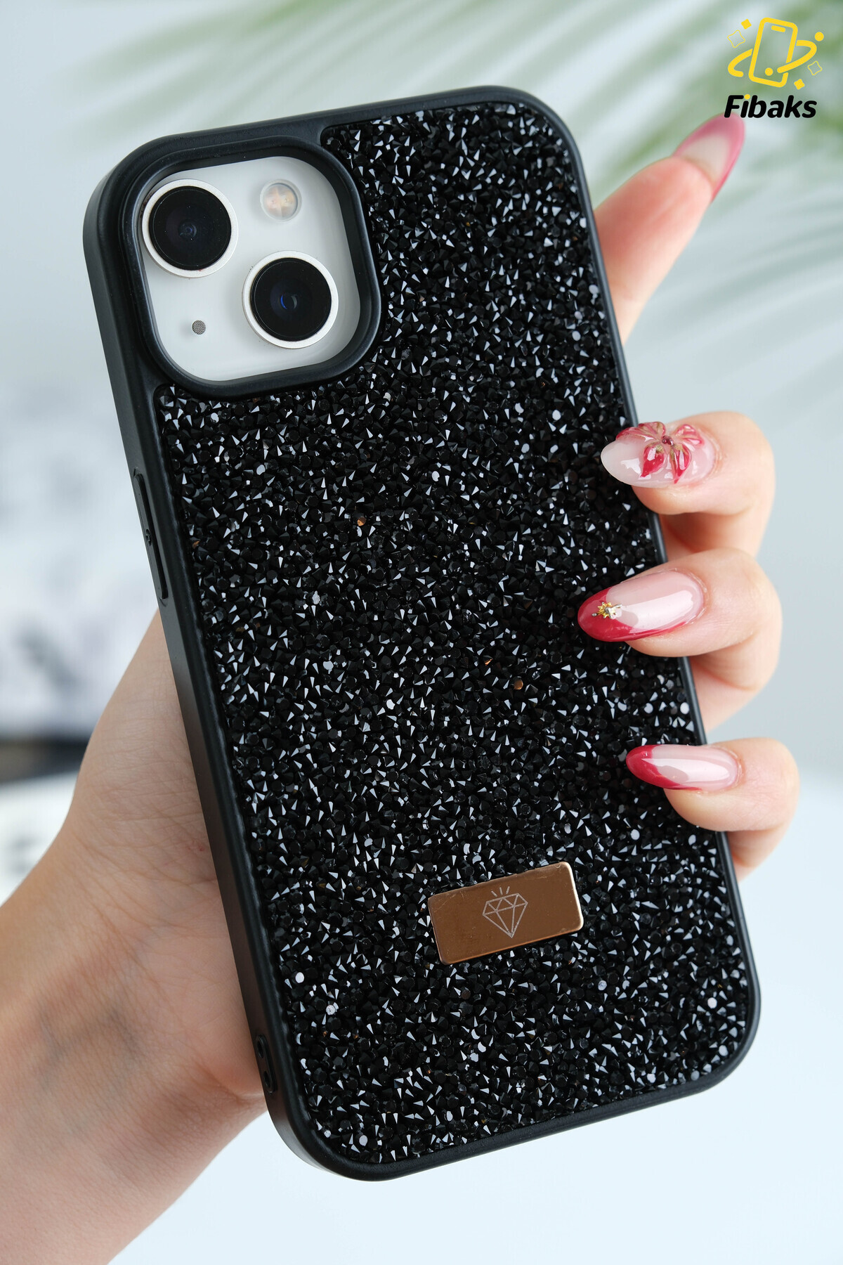 Apple iPhone 13, 14 ve 15 modellerine özel tasarlanmış elmas desenli siyah taşlı ışıltılı pırlanta silikon kılıf ile telefonunuzu şık bir şekilde korur.