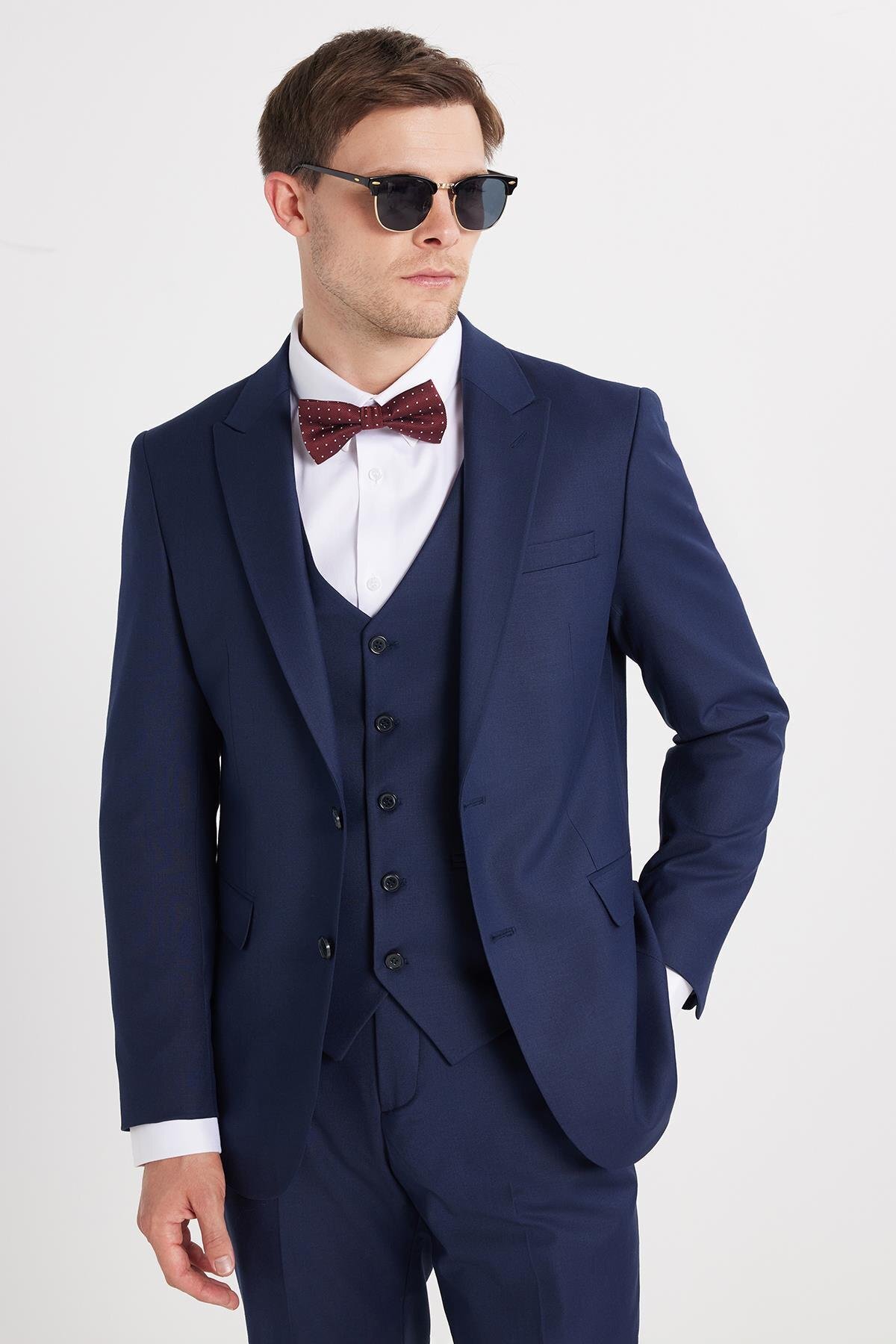 Erkek Slim Fit Lacivert Esnek Likralı Kumaş Sivri Yaka Yelekli Takım Elbise