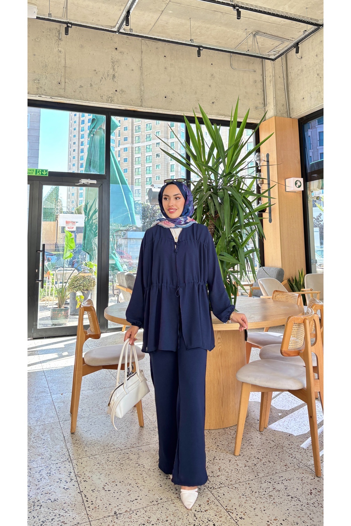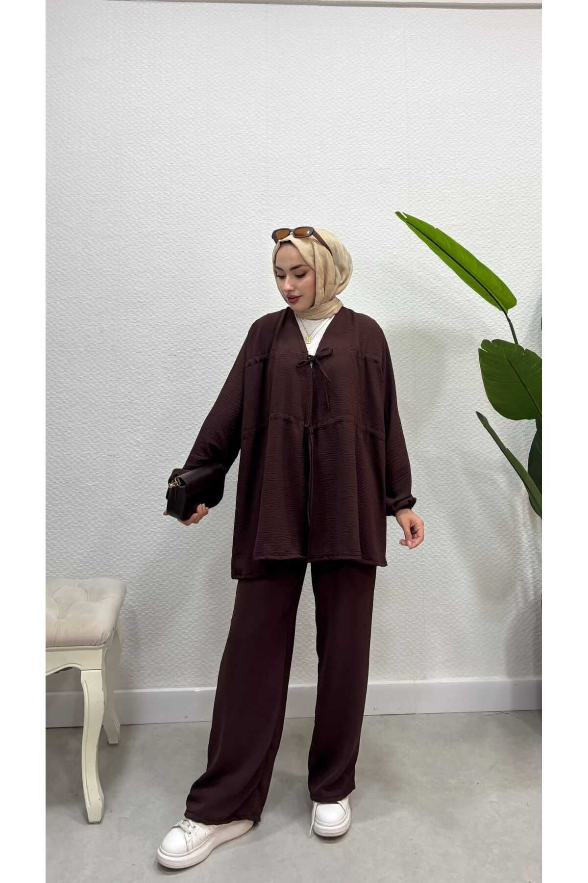 - Rahatlık ve şıklığı bir arada sunan Aerobin bağcıklı ikili takım pantolon tesettür alt üst, günlük kullanım için idealdir.