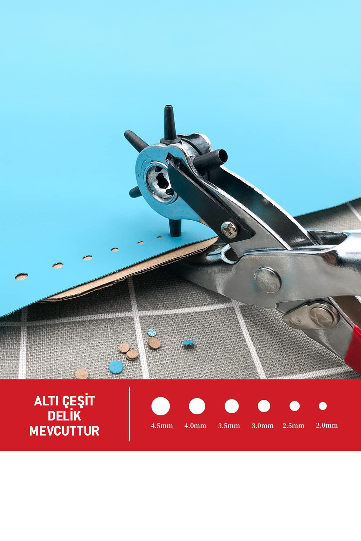 - 6 farklı delik çapı (2 mm – 4.5 mm arası) Döner başlıklı yapı: hızlı uç değişimi, Paslanmaz ve dayanıklı metal gövde, Ergonomik, el yormayan sap tasarımı, Kaymaz plastik kaplama, güvenli kullanım, Deri, kumaş, kanvas, plastik gibi yüzeylerde kullanıma uygundur.