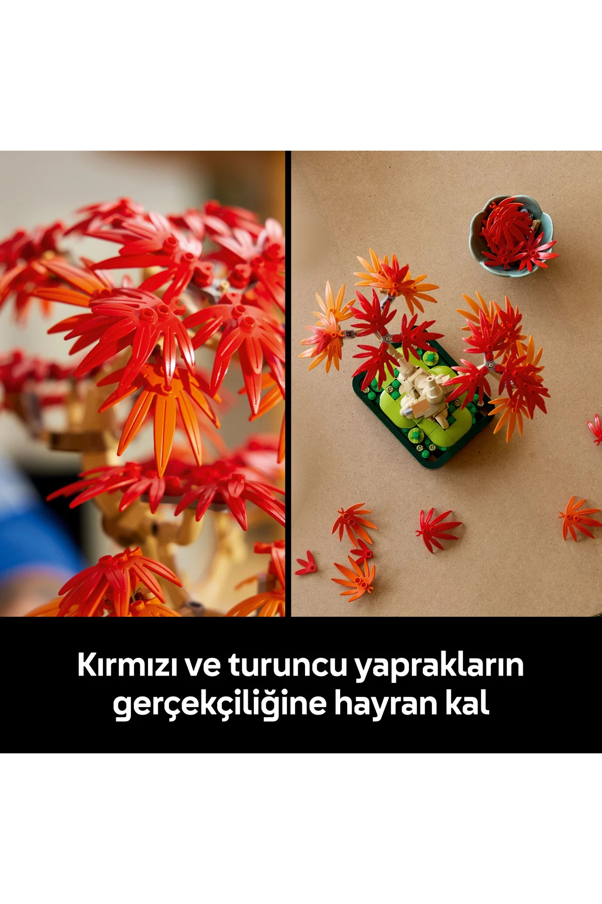 Gerçek kırmızı akçaağaç bonsai ağaçlarının canlılığını ve zarafetini yansıtan bu LEGO bitki modeli, kırmızı ve turuncu yapraklarla bezenmiştir ve koyu yeşil bir saksı içinde sergilenir. Yapım süreci boyunca stres atmanızı ve rahatlamanızı sağlayan bu keyifli aktivite, tamamlandığında bulunduğu ortama sakinlik ve zarafet katar.