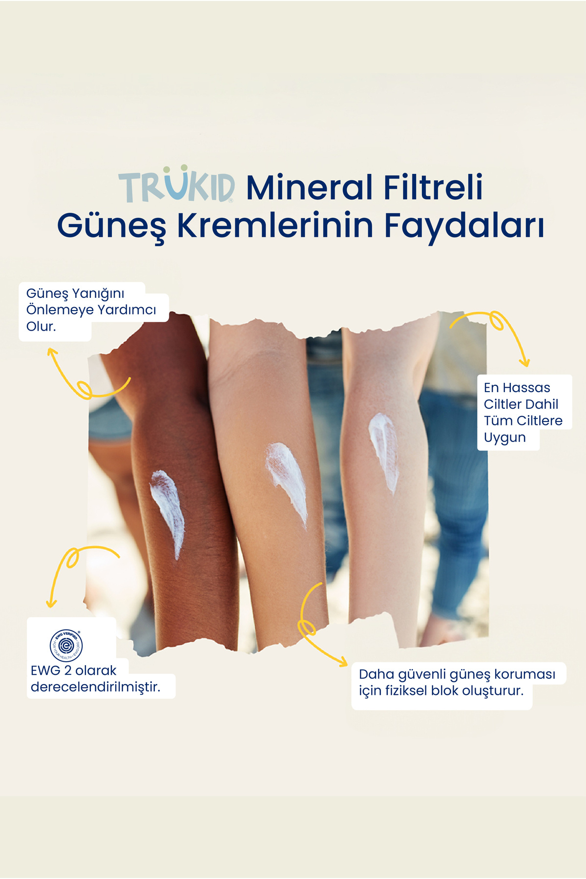 Üstelik parfümsüz yapısıyla hassas ciltleri rahatsız etmez! ☀️ SPF50 – Yüksek Güneş Koruması 🌿 %100 Mineral Filtreli – Nano partikül içermez 👶 Bebek ve çocuk cildine özel formül 💧 Parfümsüz – Rahatsız etmez, doğal kokusuz formül 🌊 Deniz dostu – Mercanlara zarar vermez 🌱 Paraben, ftalat ve toksik kimyasallar içermez 🐰 PETA Sertifikalı – Hayvanlar üzerinde test edilmemiştir ♻️ BPA içermeyen, geri dönüştürülebilir ambalaj ✔ Neden TruKid Easy On SPF50? Hassas ciltlerde bile güvenle kullanılabilir UVA/UVB’ye karşı geniş spektrum koruma Doğal içerikli, temiz içerik sever ebeveynlerin favorisi Pediatrist ve dermatologlar tarafından test edilmiştir A Vitamini türevleri (retinol) içermez – hassasiyet riski yok 🌿 Güçlü ve Nazik İçerikler: Çinko Oksit: Geniş spektrum fiziksel güneş koruması sağlar Aloe Vera: Cildi rahatlatır ve nemlendirir Skualen & Jojoba Yağı: Cildi besler ve yumuşaklık kazandırır Bisabolol: Cilt tahrişlerini yatıştırır Hyaluronik Asit: Cildin nem dengesini sağlar ve pürüzsüzlük verir ☀️ Kullanım Önerisi: Güneşe çıkmadan 15 dakika önce bol miktarda uygulayın 60 dakikada bir veya yüzme, terleme, kurulama sonrası tekrar uygulayın Güneşin yoğun olduğu saatlerde (10:00 – 14:00) gölgeyi tercih edin, şapka, uzun kollu kıyafetler ve gözlük kullanın 👶 Doğal Koruma, Huzurlu Oyun Saatleri! TruKid Easy On SPF50 ile cilt dostu ve çevre dostu bir korumaya sahip olun.