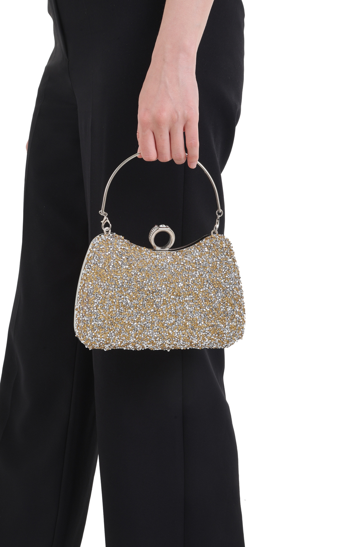 - Zarif taş işlemeleriyle süslenmiş, göz alıcı bir tasarıma sahip kadın kol ve omuz abiye çantası.