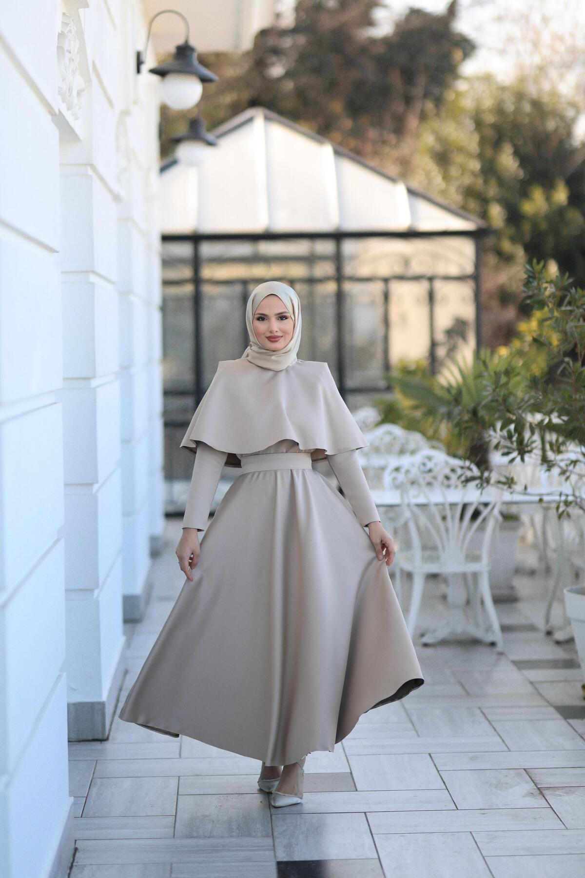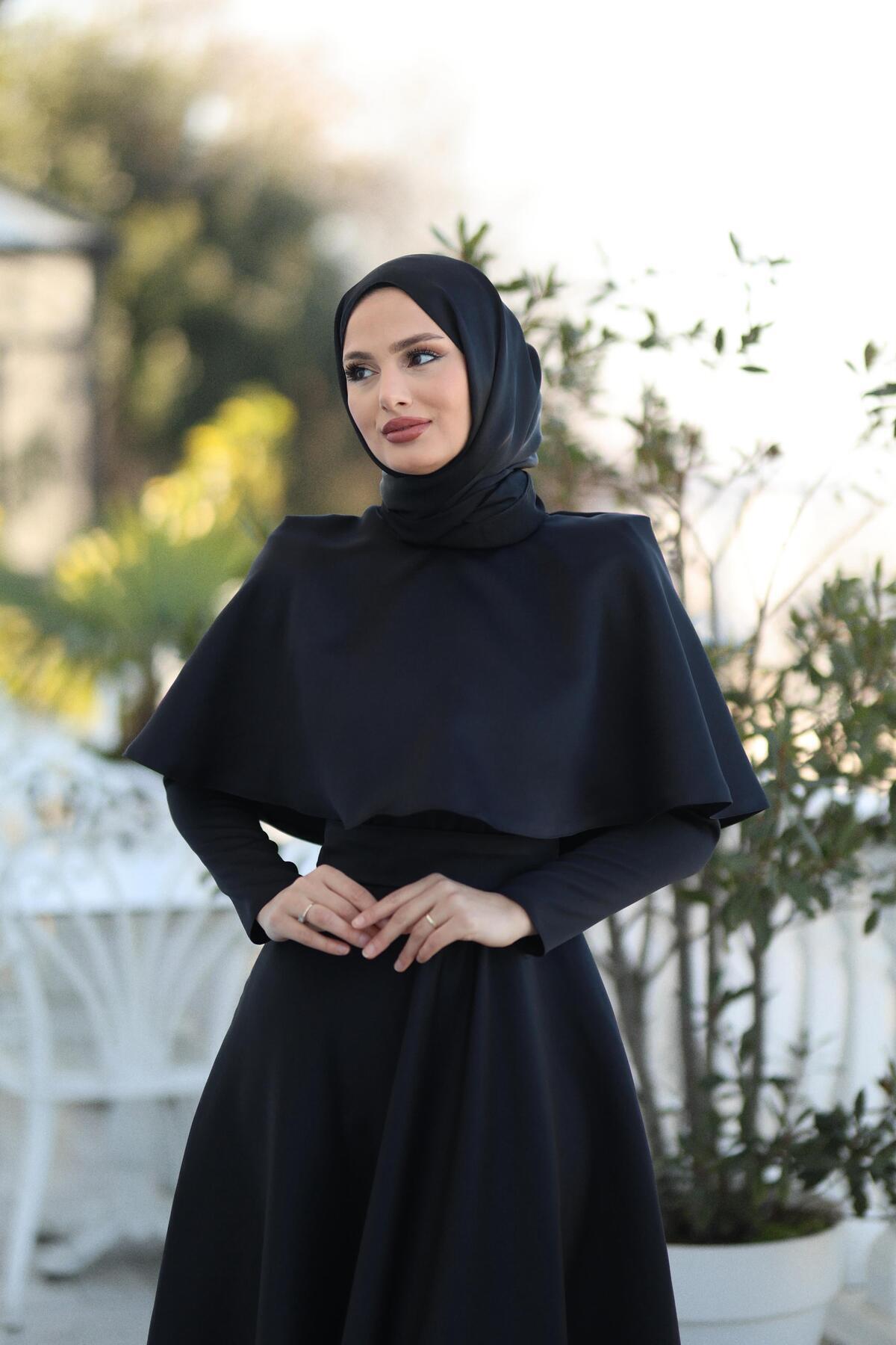 - Zarif pelerin detayları ile zenginleştirilmiş, her mevsim rahatlıkla tercih edilebilen tesettür abiye.