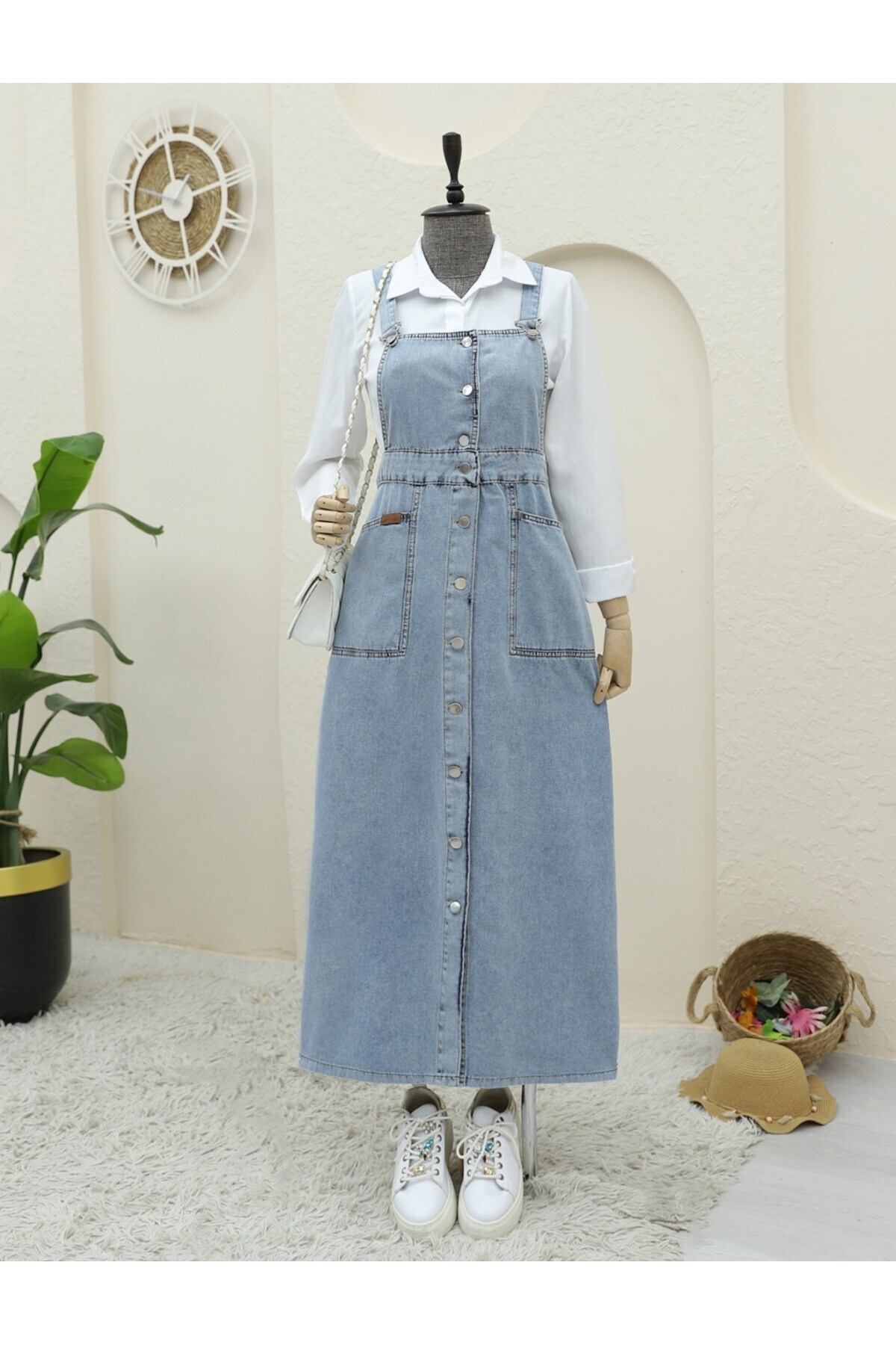 Boydan Düğmeli Çift Cepli Kot Salopet