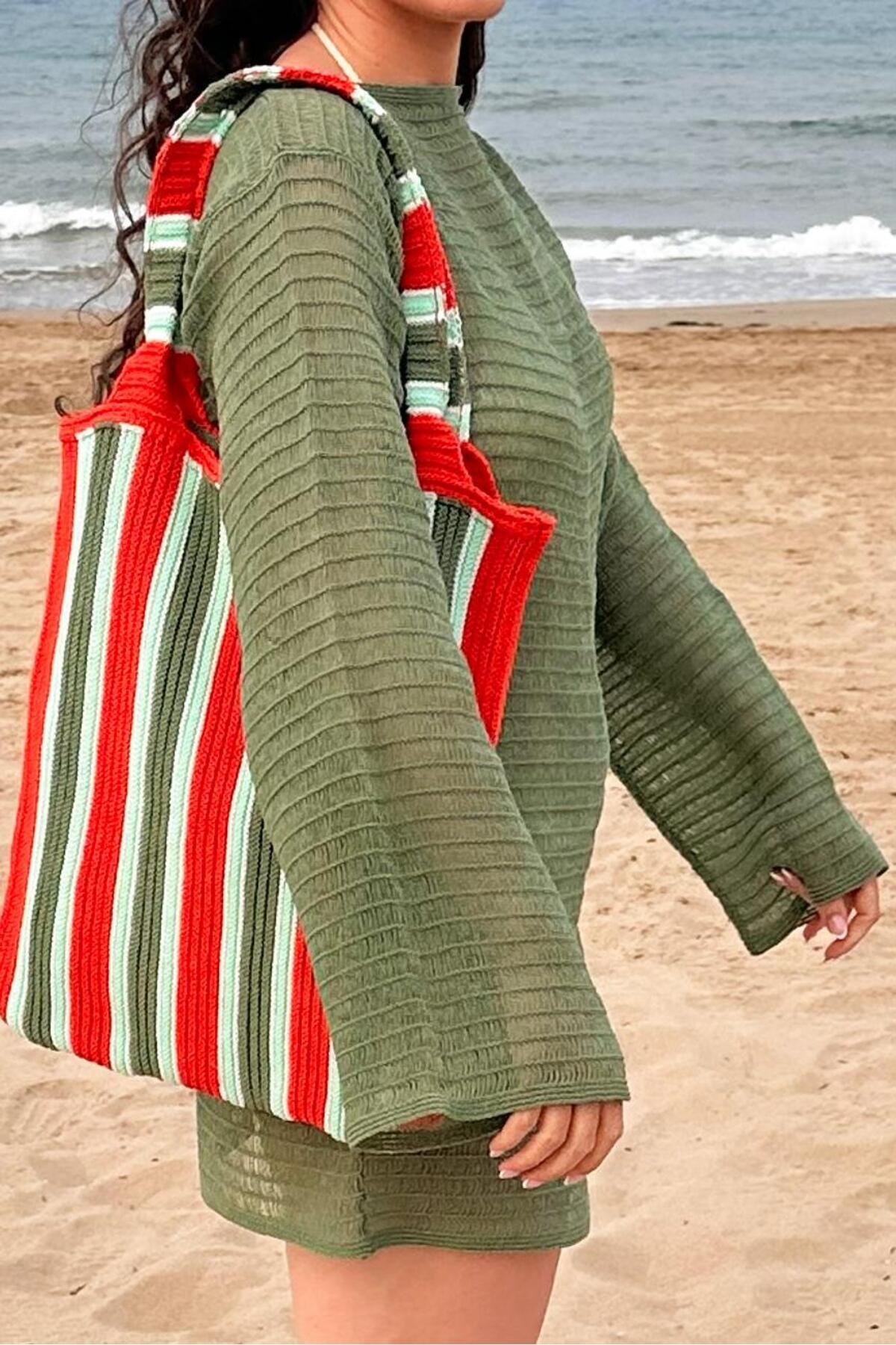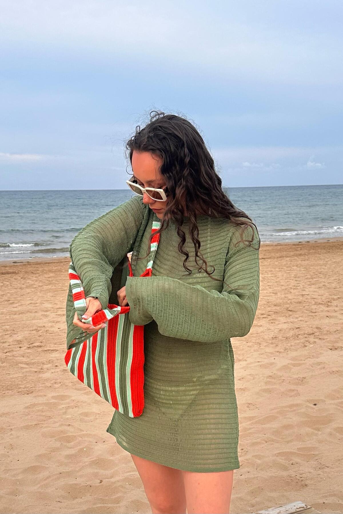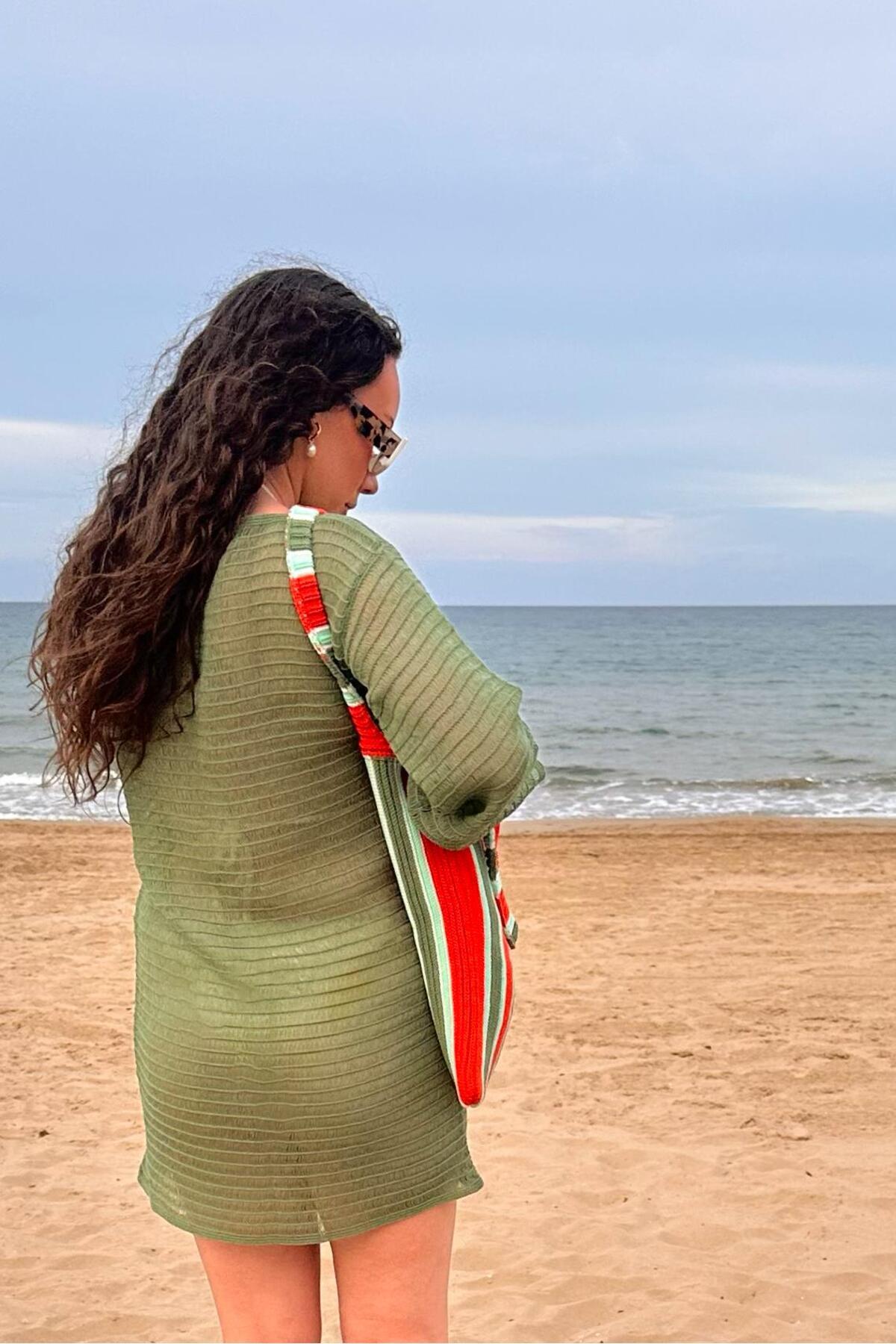 Delikli triko kumaş yapısı ile sahilde veya günlük kullanımda şık ve zamansız bir stil oluşturmanızı sağlar.