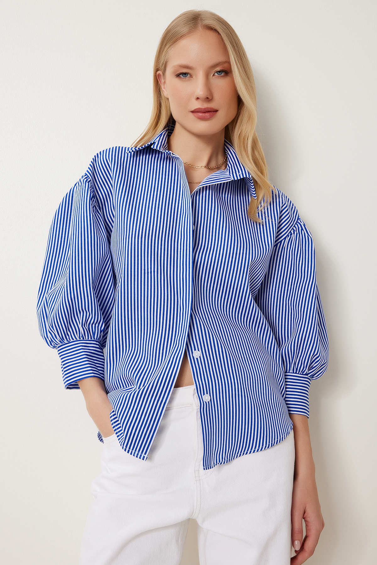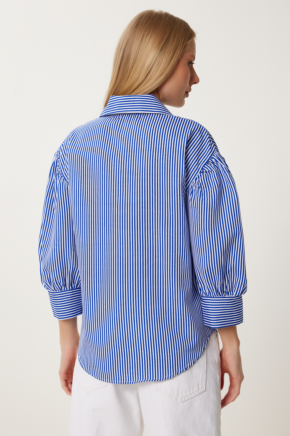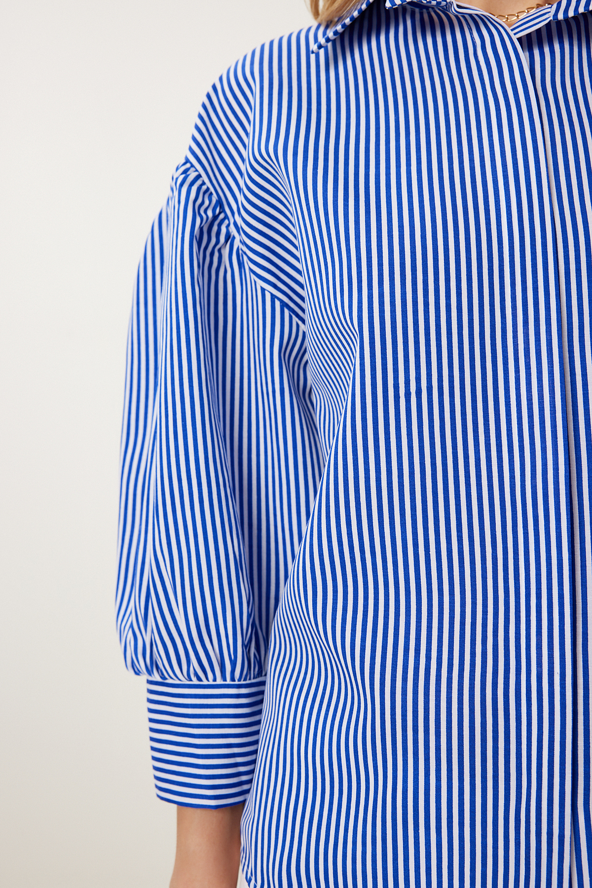 Kadın Mavi Beyaz Çizgili Balon Kollu Poplin Gömlek ZV00316