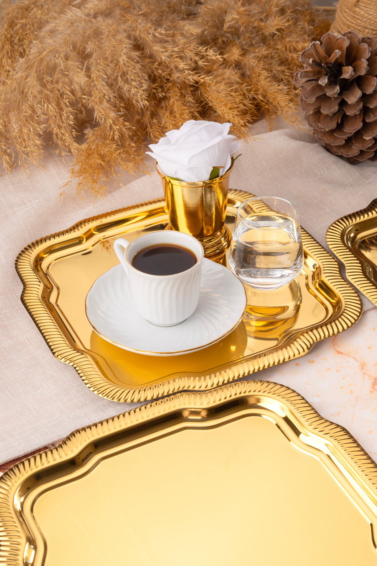6'lı Lüx Kenar Çizgi Desenli Gold Papatya model Paslanmaz Çelik Servis , Çay ,kahve Sunum Tepsisi