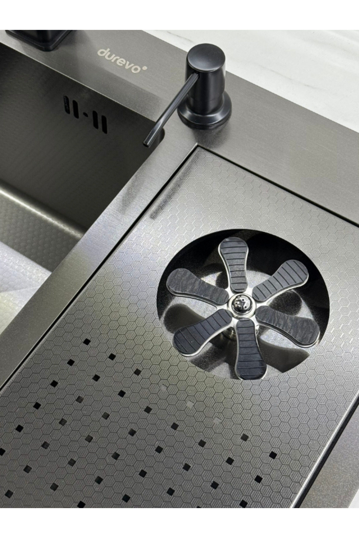 Moderno Paslanmaz Çelik Bardak Yıkamalı Akıllı Mutfak Evyesi Bal Peteği Yüzey Siyah 68x45cm Eviye