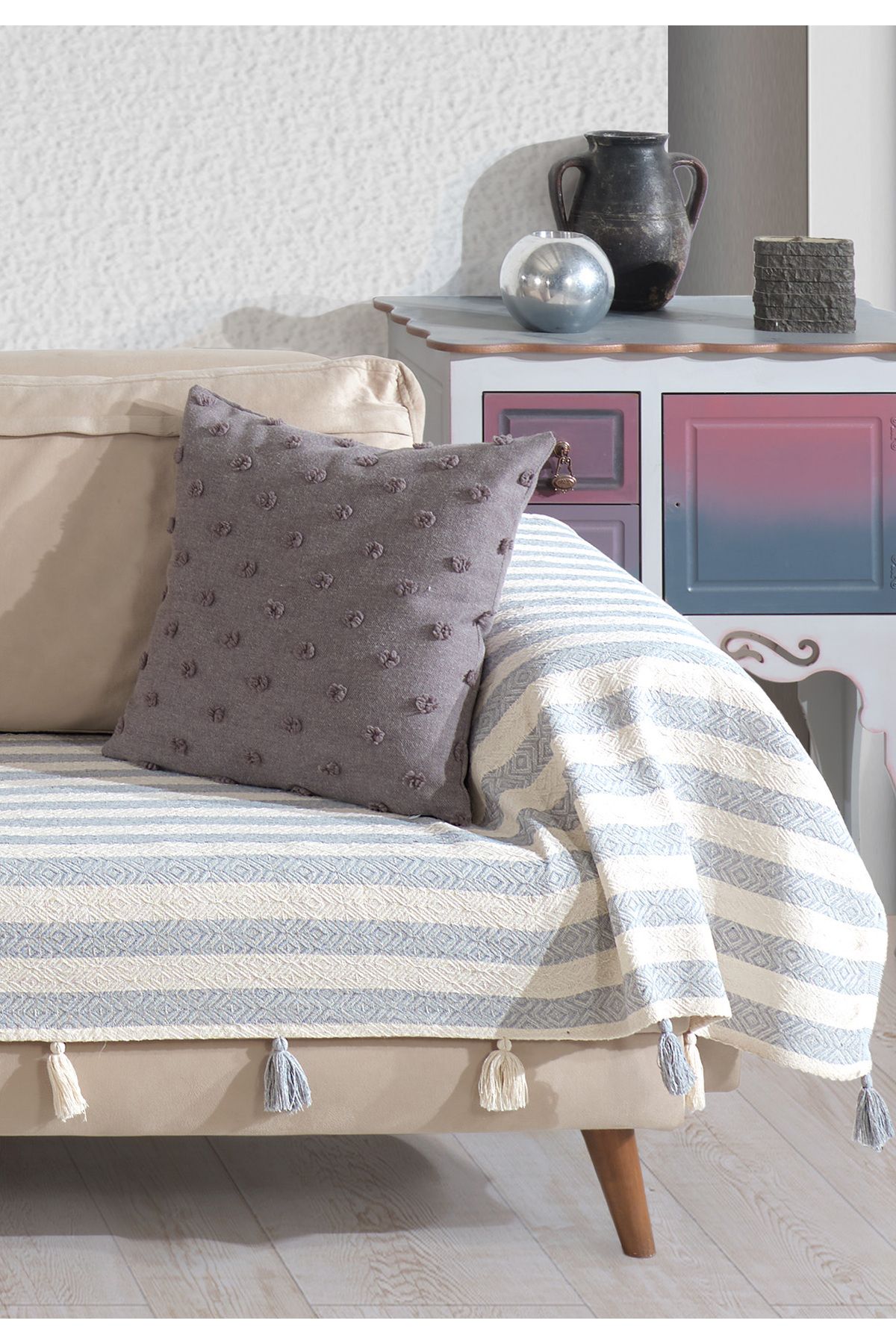 Pera Bej Püsküllü Kolları Örten Koltuk Örtüsü 300x110 cm 3m Battal Boy Ponponlu Kanepe Divan Çekyat