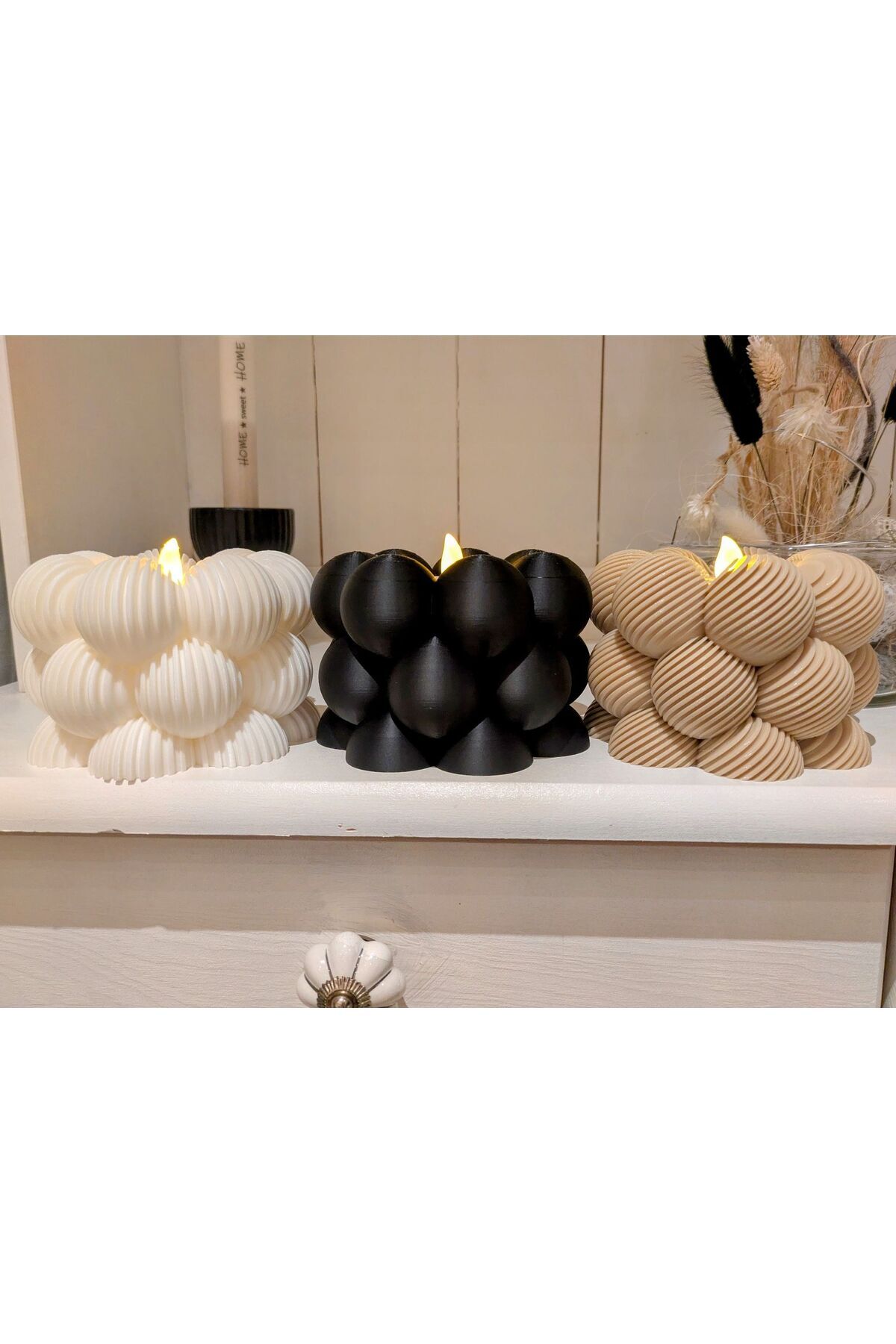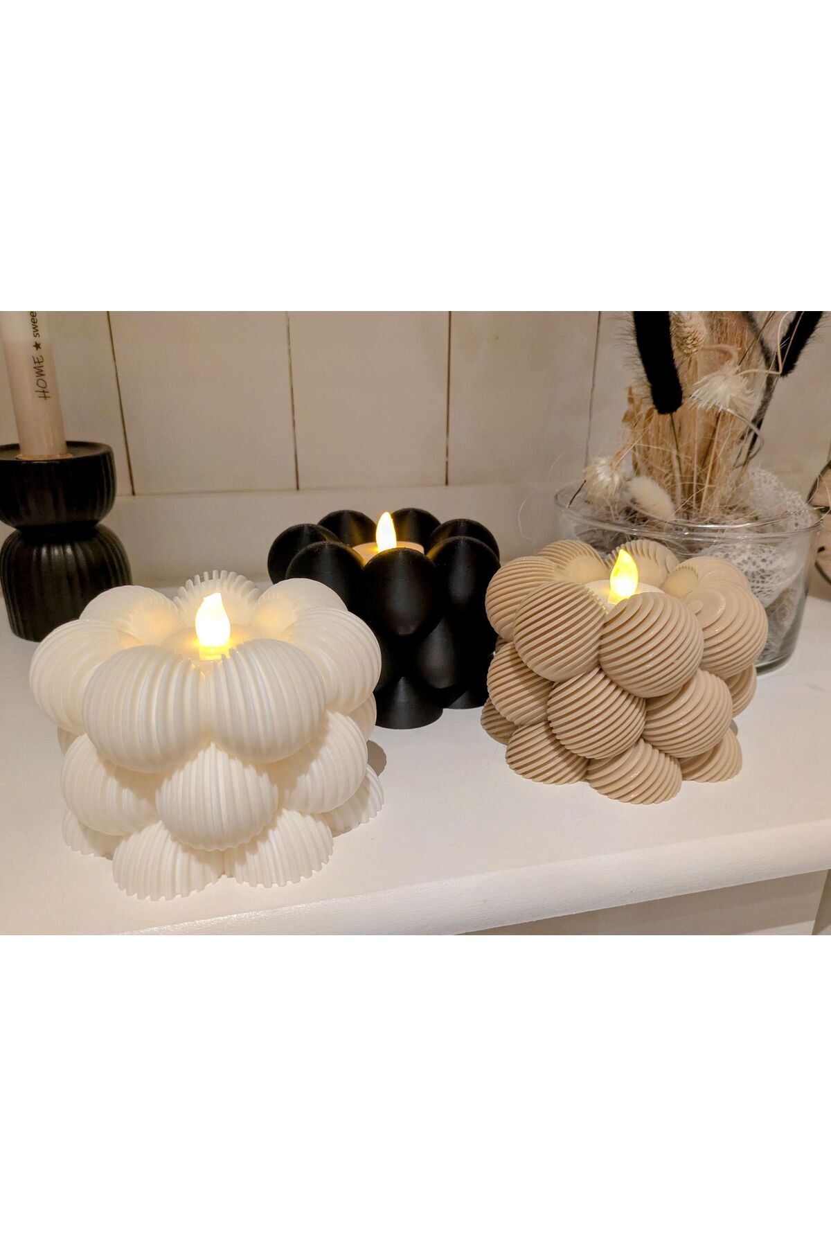 - Üçlü set halinde sunulan bu dekoratif mumluk, evinizin atmosferini zenginleştirir.