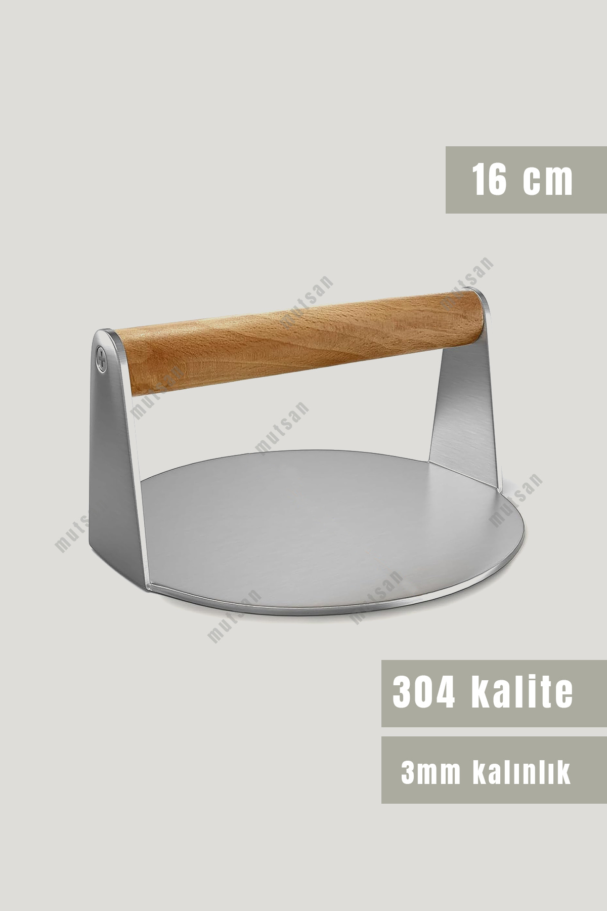304 Paslanmaz Çelik Burger Presi | Ahşap Saplı Smasher | Profesyonel Izgara Aksesuarı | 16 cm