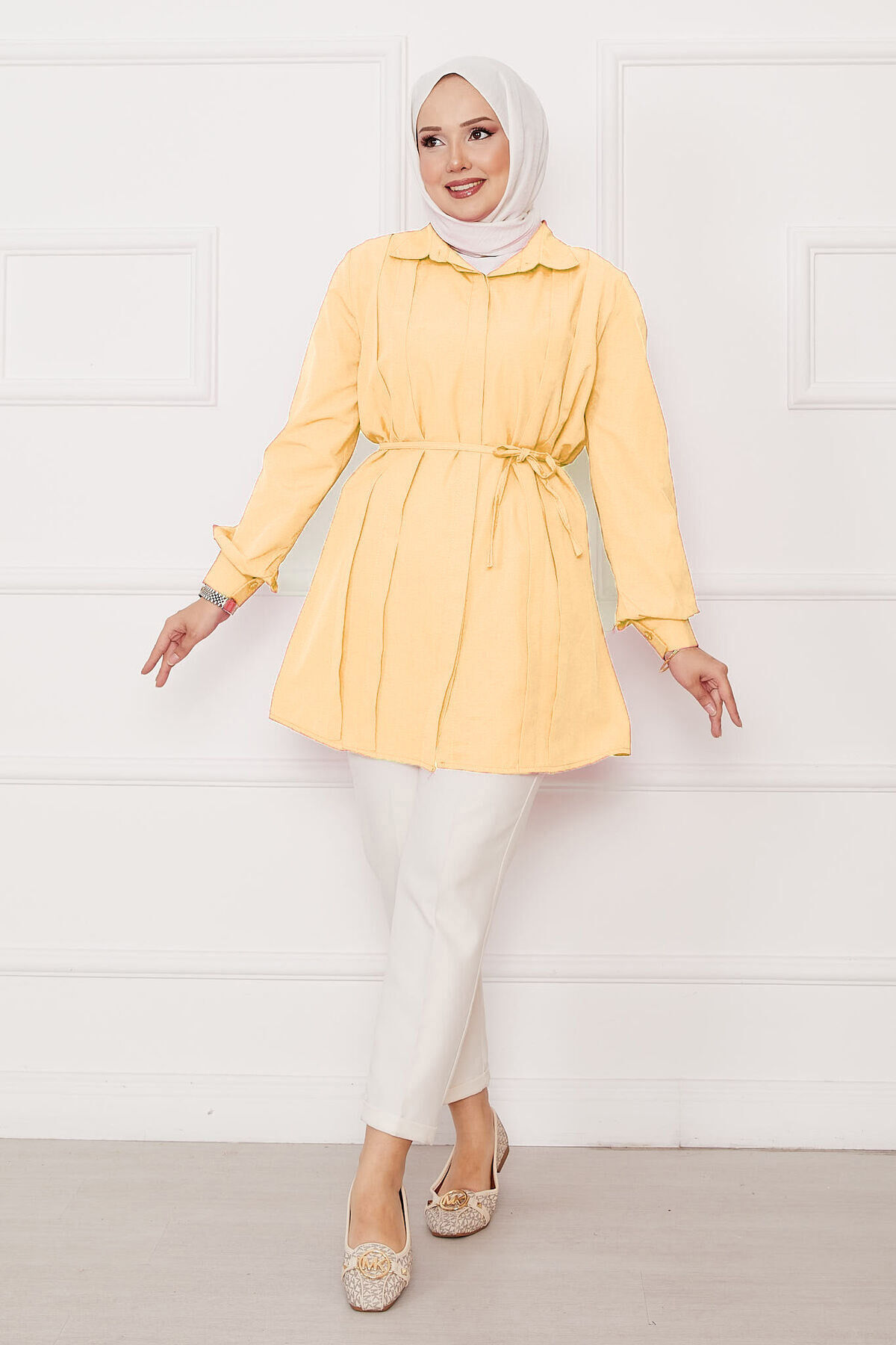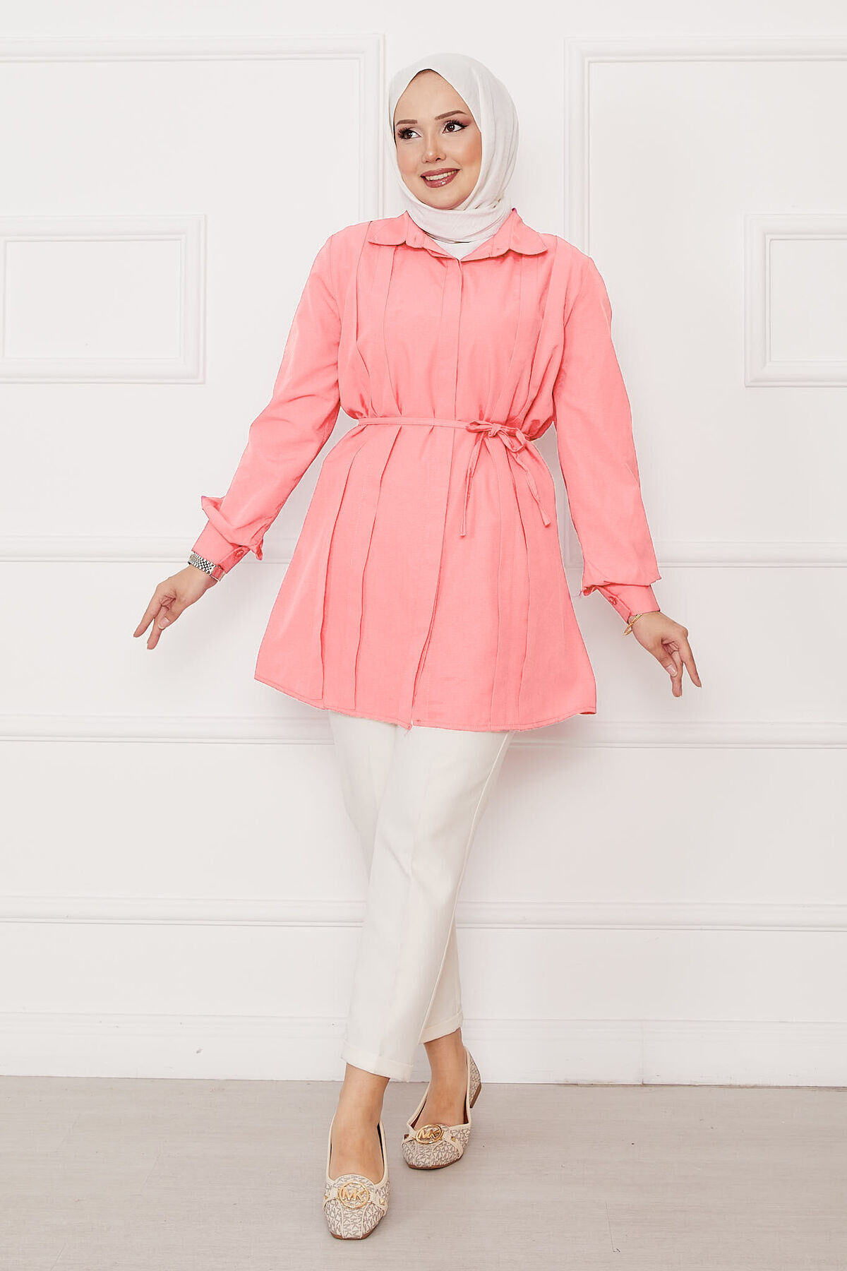 Boydan Gizli Düğmeli Pile Detaylı Tesettür Gömlek