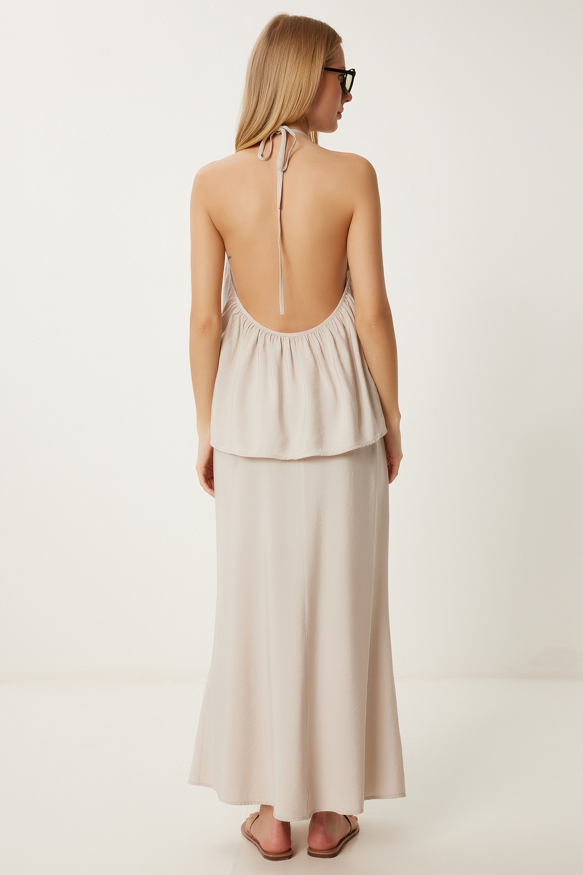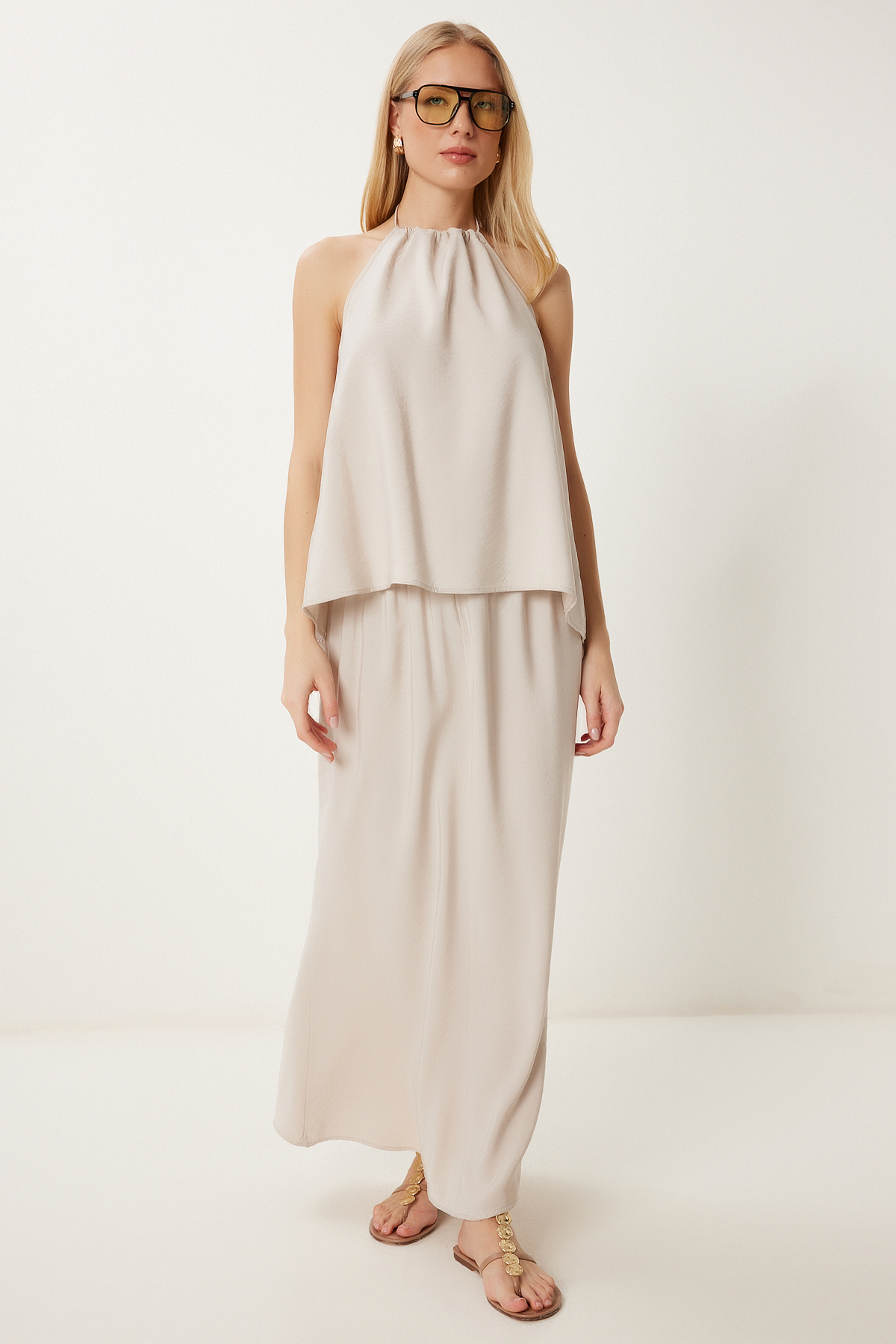 Halter yaka, boyundan bağlamalı bluz ve elastik bel, astarsız etekten oluşan modal takım İçerik: %90 Modal %10 Polyester Ürün Boyu: 54 cm Etek Boyu: 93 cm 30° makinede yıkanabilir.