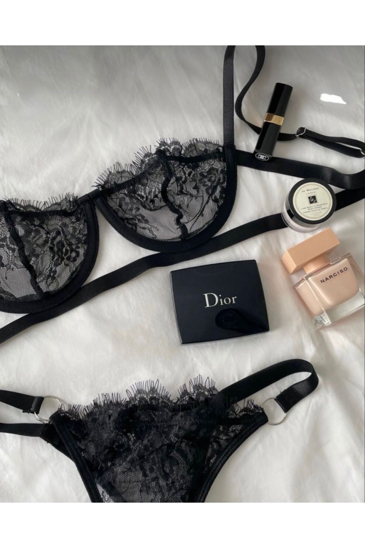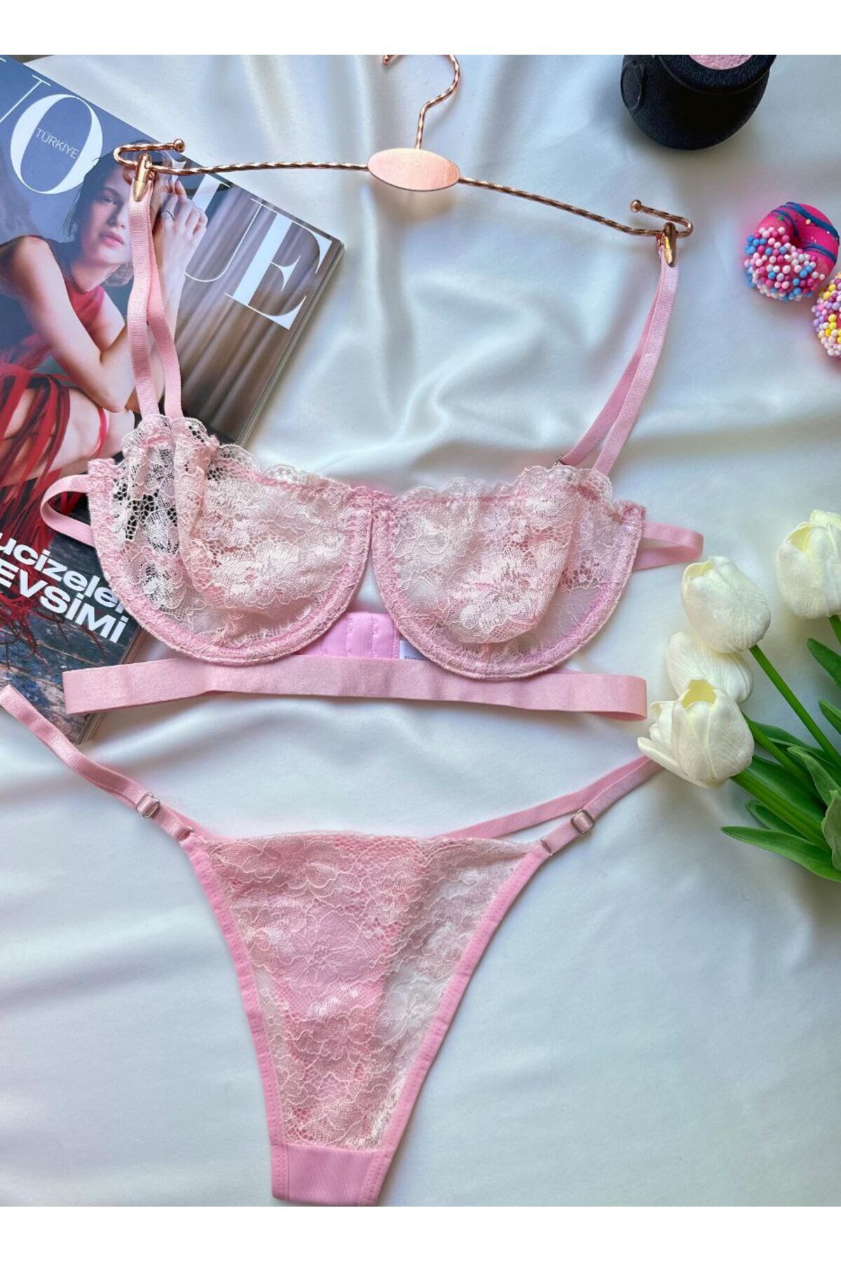 - Zarif çiçek desenleriyle süslenmiş, feminen bir tarz sunan dantelli balenli iç çamaşır takımı.