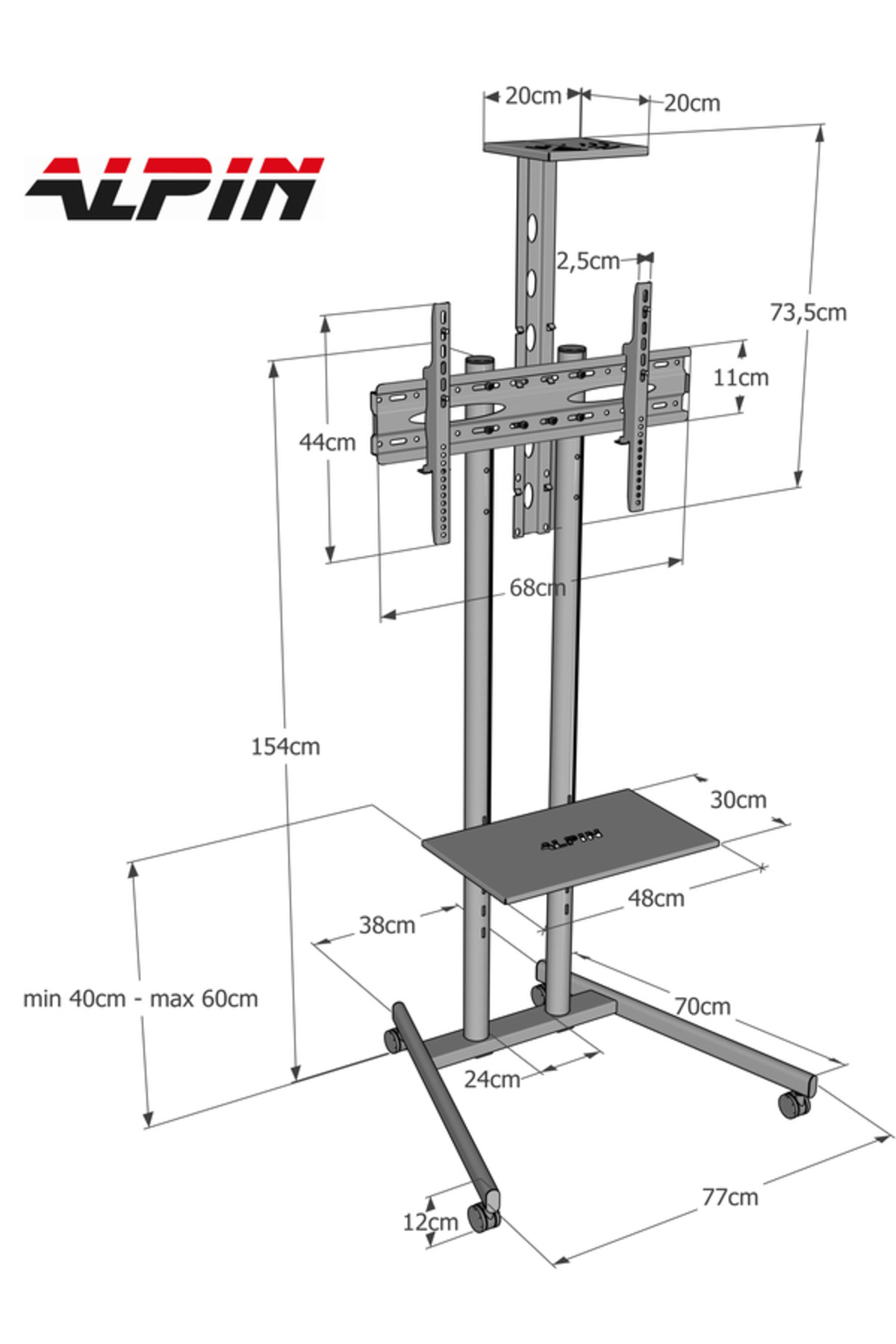 MODEL KODU : ALPVKBS-003 UYUMLU EKRANLAR : 40” inç, 42” inç , 43” inç , 49” inç , 50” inç, 55” inç ,58” inç, 60” inç, 65” inç , 70” inç , 75” inç ÜRÜN ÖLÇÜLERİ Tv Standının Yerden Yüksekliği : 154cm (Video Kamera Aparatsız) Yükseklik: Min: 182cm Max: 213cm (Video Kamera Aparatı ile birlikte) Bilgisayar Sehpası Ölçüsü : 30x48 cm Bilgisayar Sehpasının Yerden Yüksekliği : Min:40cm Max:60cm Tv Askı Aparatı Ölçüsü : 68x11 cm Taşıyıcı Borular Arası Mesafe : 24 cm ÖN VE ARKA AYAK ÖLÇÜLERİ Ön ayaklar arası mesafe : 77 cm Arka ayaklar arası mesafe : 38 cm Derinlik : 70 cm ÜRÜN AĞIRLIĞI : 13.5 Kg Siyah Metal Gövde Ayarlanabilir Yükseklik 1.5 mm Metal Kalınlığı ** 50 Kg’a kadar Taşıma Kapasitesi ** Televizyonun ağırlığı ile ürünün Taşıma Kapasitesini Karşılaştırınız ** TV/Fuar standı olarak da kullanılabilme özelliği ile etkinliklerde ve fuarlarda ekstra depolama alanı sunar.