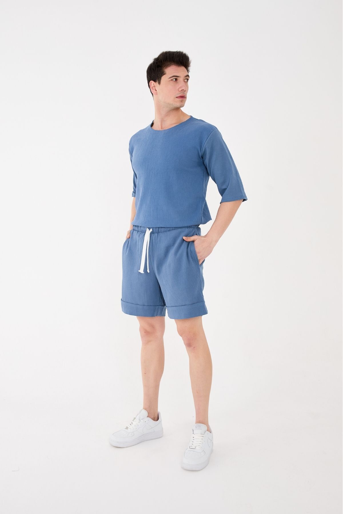 %100 Pamuk Bol Kalıp Kadın Erkek Kısa Yazlık Şort İndigo Mavi
