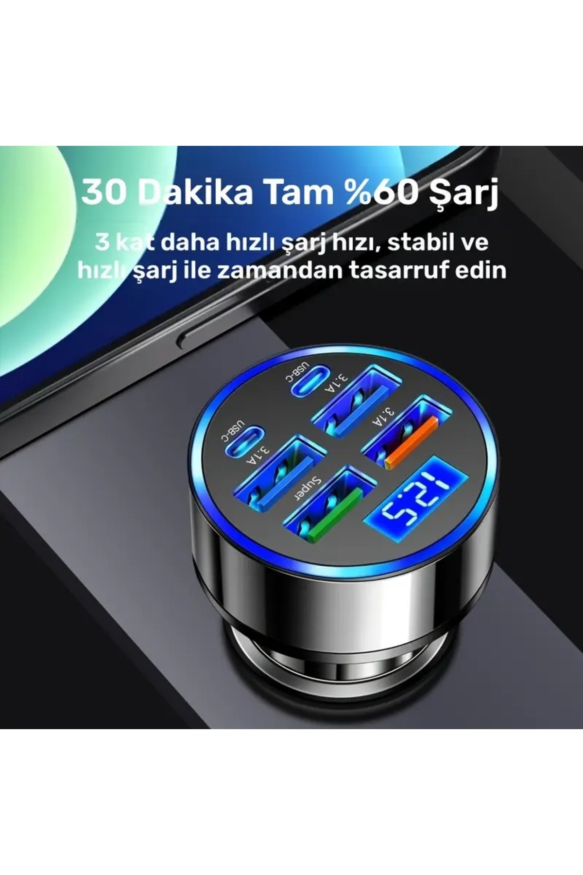Araç Şarj Cihazı 6 port | 2PD + 4USB, Hızlı Şarj, Tip-C, Dijital Ekran